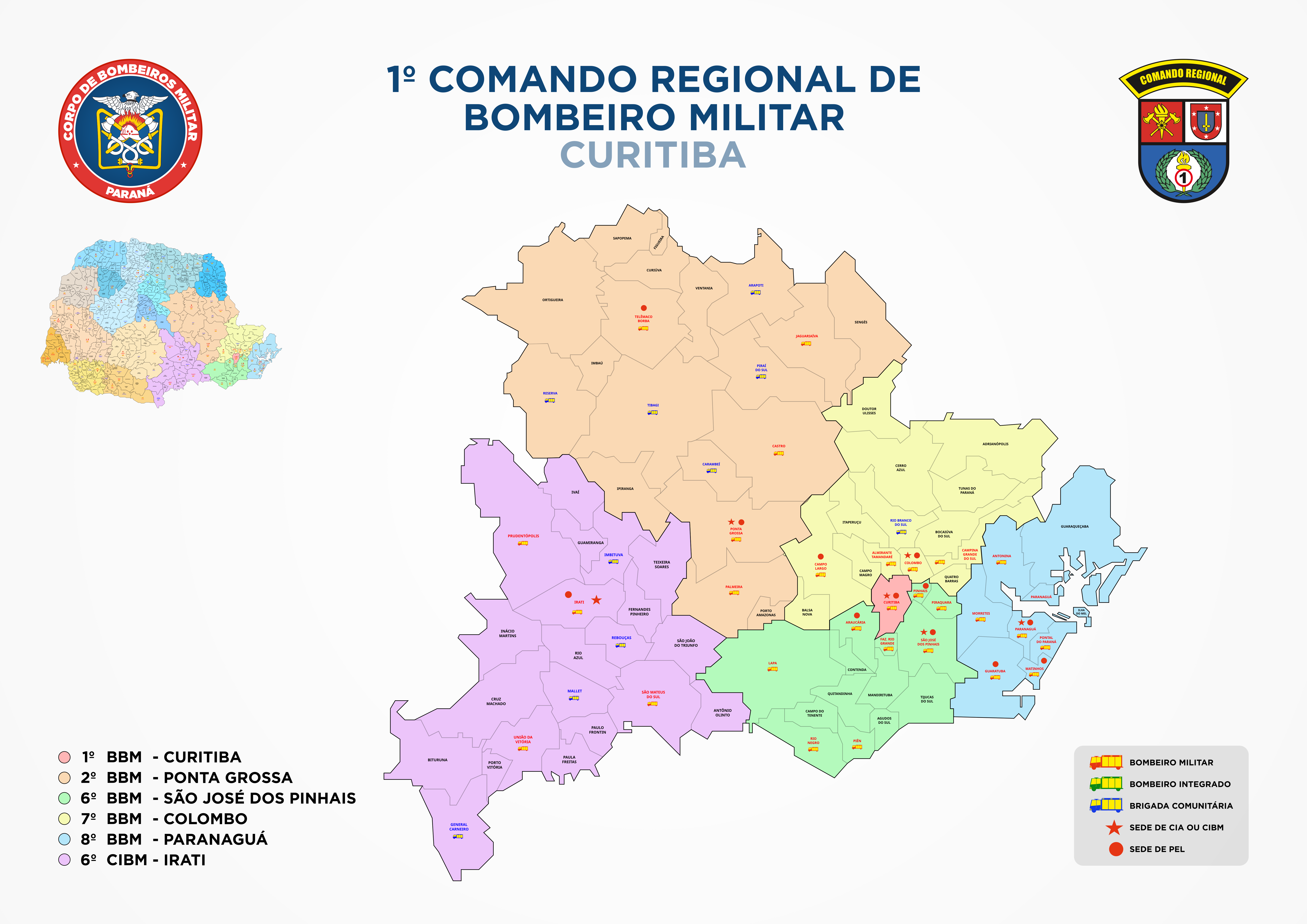 Criado em 6 de abril de 2019, o 1º CRBM tem responsabilidade na circunscrição territorial sobre 36 municípios, distribuídos nas áreas de Curitiba, São José dos Pinhais, Colombo, Paranaguá.