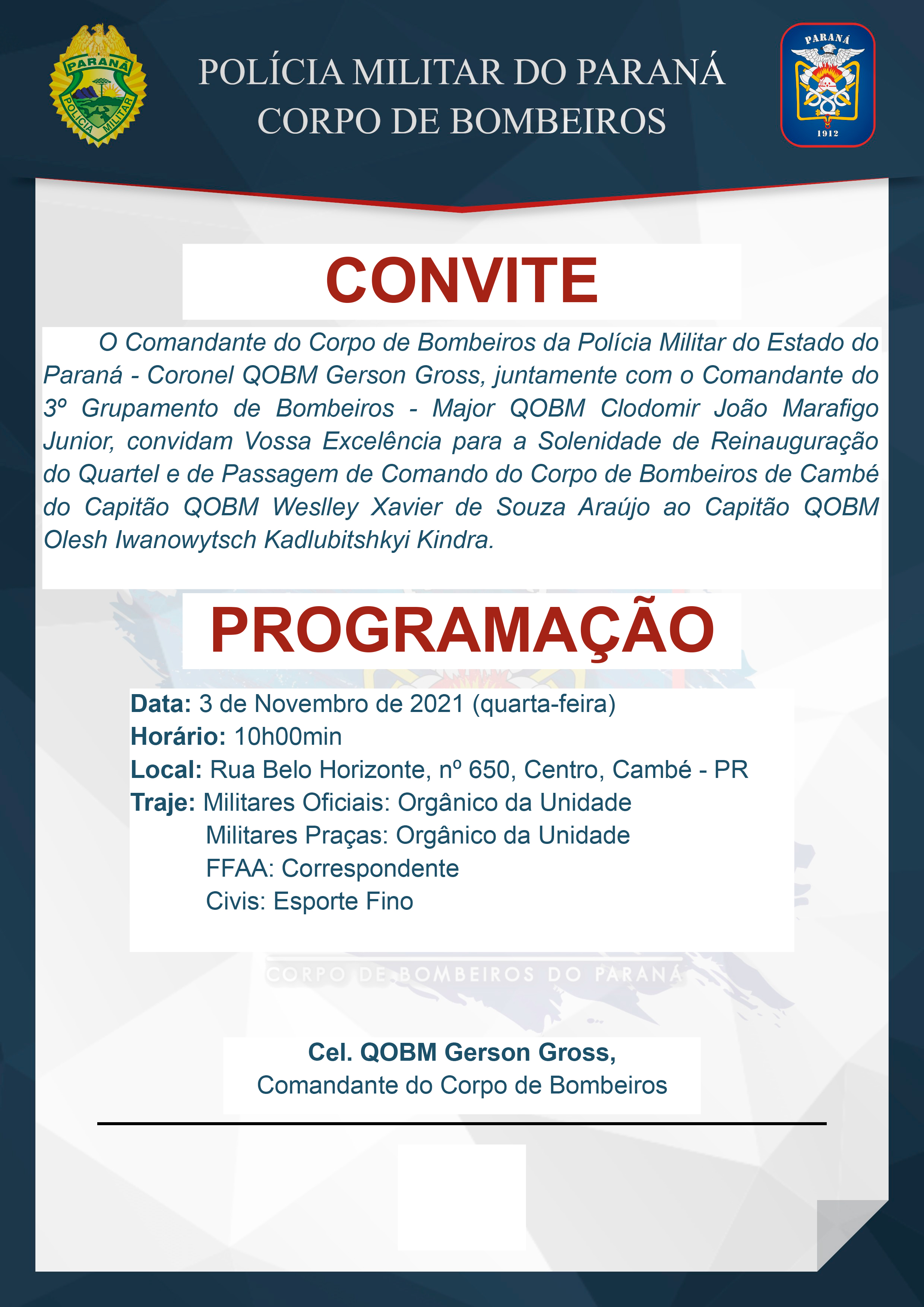 CCB Convite de Passagem de Comando e Reinauguração do CB Cambé 22/10/2021 - 17:19 Compartilhe: Voltar Início Imprimir Baixar