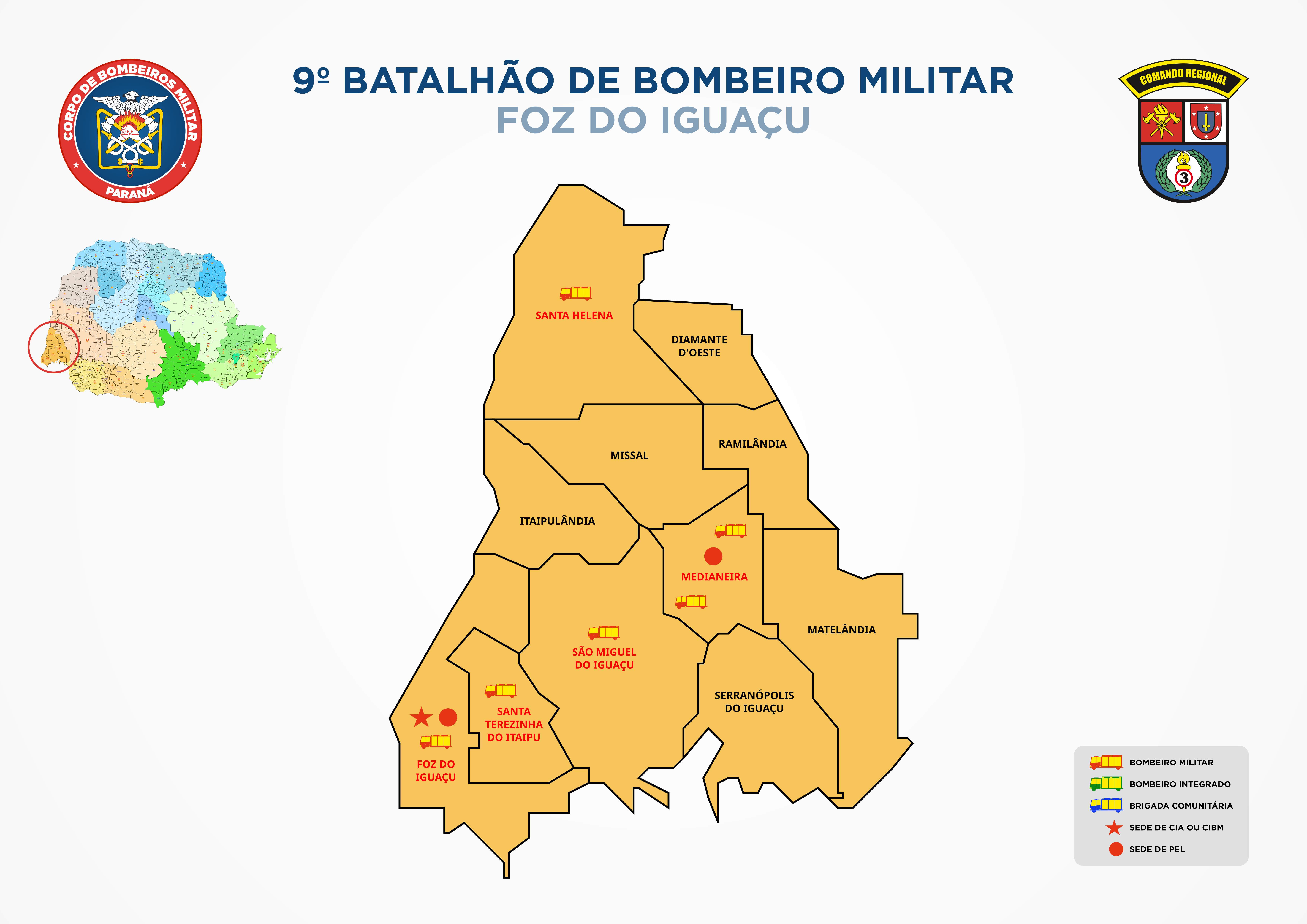 O 9° Batalhão de Bombeiro Militar sediado em Foz do Iguaçu, é a unidade responsável pelo atendimento em 11 municípios. Além de Foz do Iguaçu, a o 9º GB atende a região em ações de salvamento, buscas, resgates e defesa civil também nas cidades de Santa Terezinha de Itaipu, São Miguel do Iguaçu, Medianeira, Itaipulândia, Ramilândia, Matelândia, Missal, Serranópolis do Iguaçu, Santa Helena e Diamante D’Oeste.