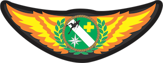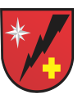 Escudo português em campo de gules ou vermelho, significado das virtudes a caridade e das qualidades seculares a valentia, o atrevimento, a vitória, a generosidade e o vencimento sem sangue, contendo um raio negro, descendo em linha de partição esquerda para a direita do escudo, separando-o em dois campos que indica o pronto e rápido atendimento, os poderes e a potência (Guelfi).