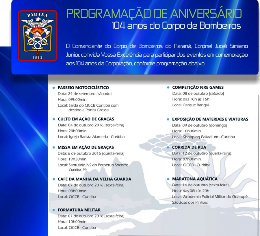 Calendário de atividades comemorativas aos 104 anos do Corpo de Bombeiros