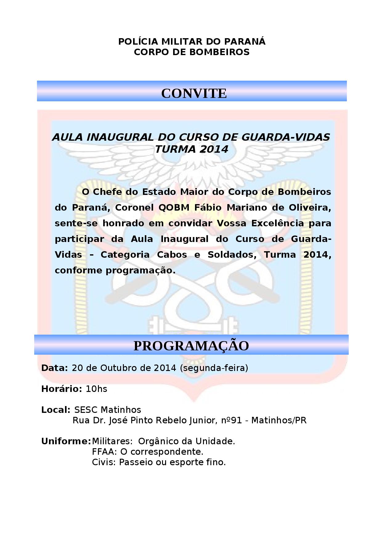 Convite para Aula Inaugural do Curso de Guarda-Vidas