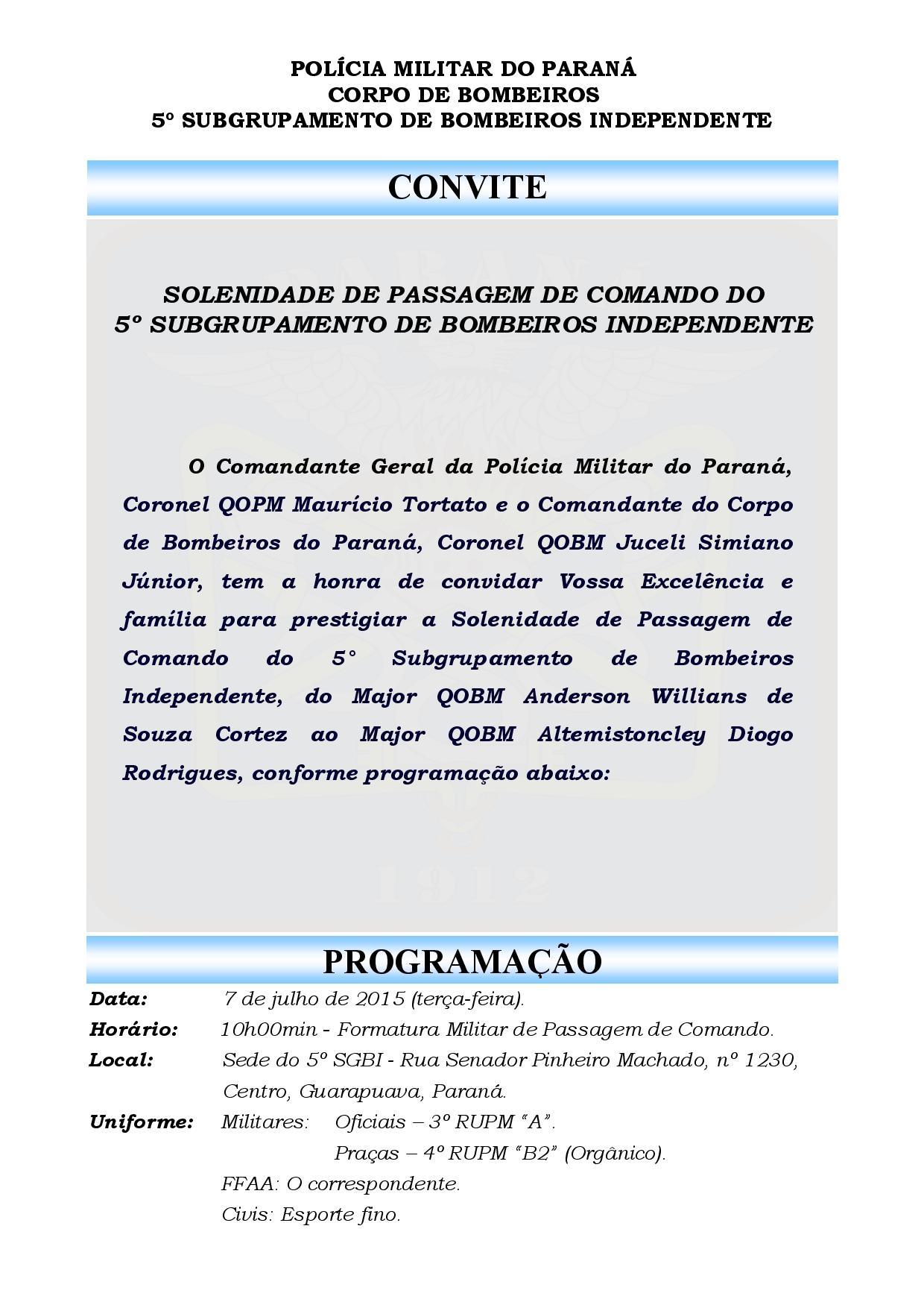 Convite para a Solenidade de Passagem de Comando do 5 SGBI