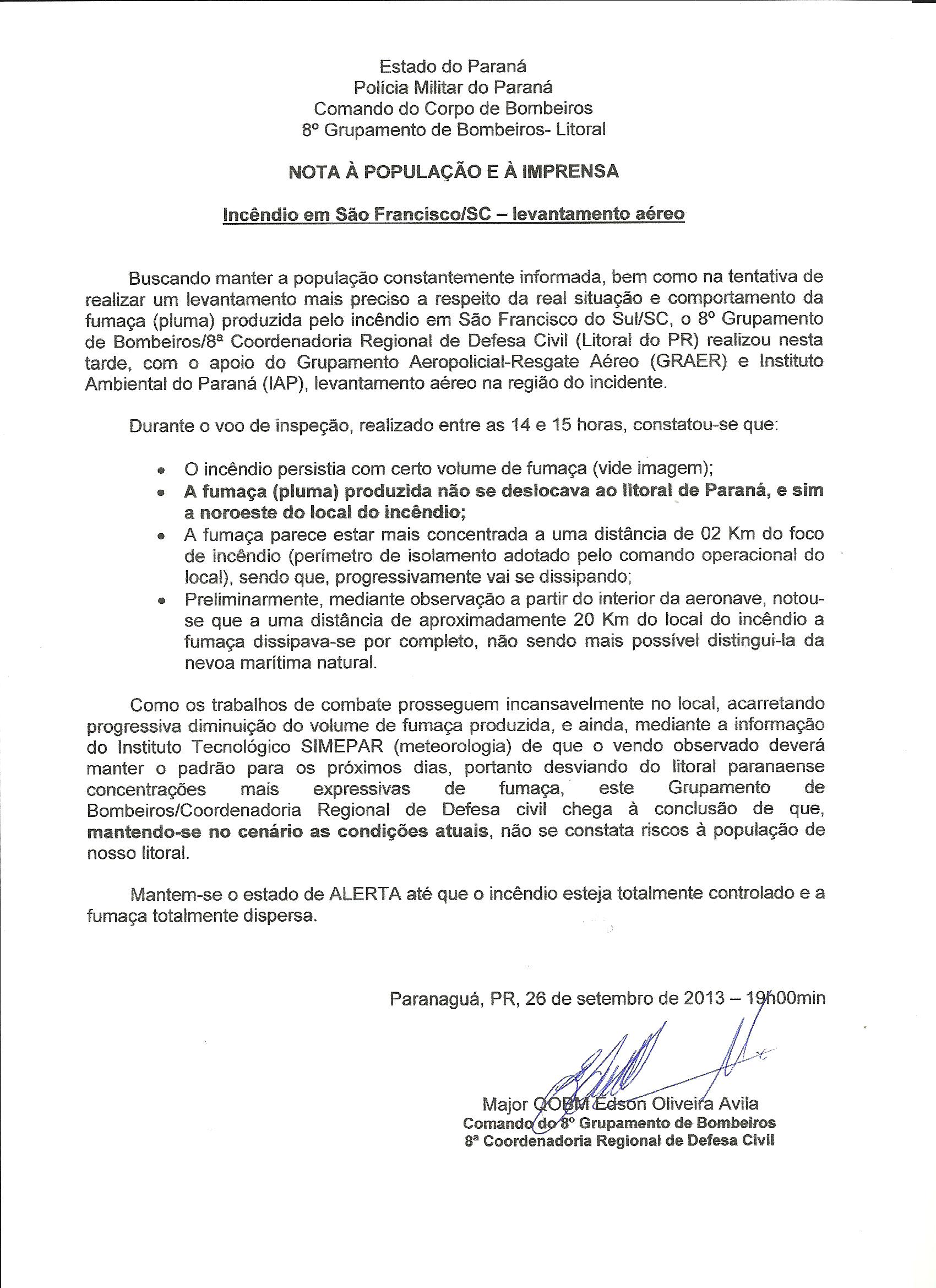 NOTA À POPULAÇÃO E À IMPRENSA Incêndio em São Francisco/SC – levantamento aéreo