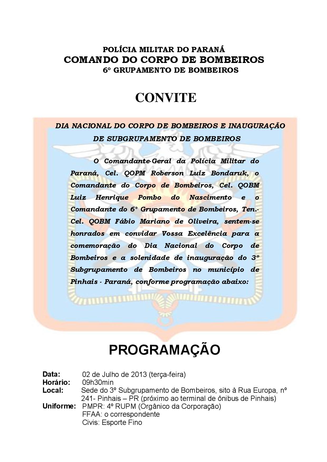 O 6° GB convida a todos para participarem da comemoração do Dia Nacional do Corpo de Bombeiros e a solenidade de inauguração do 3° Subgrupamento de Bombeiros no município de Pinhais