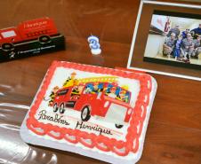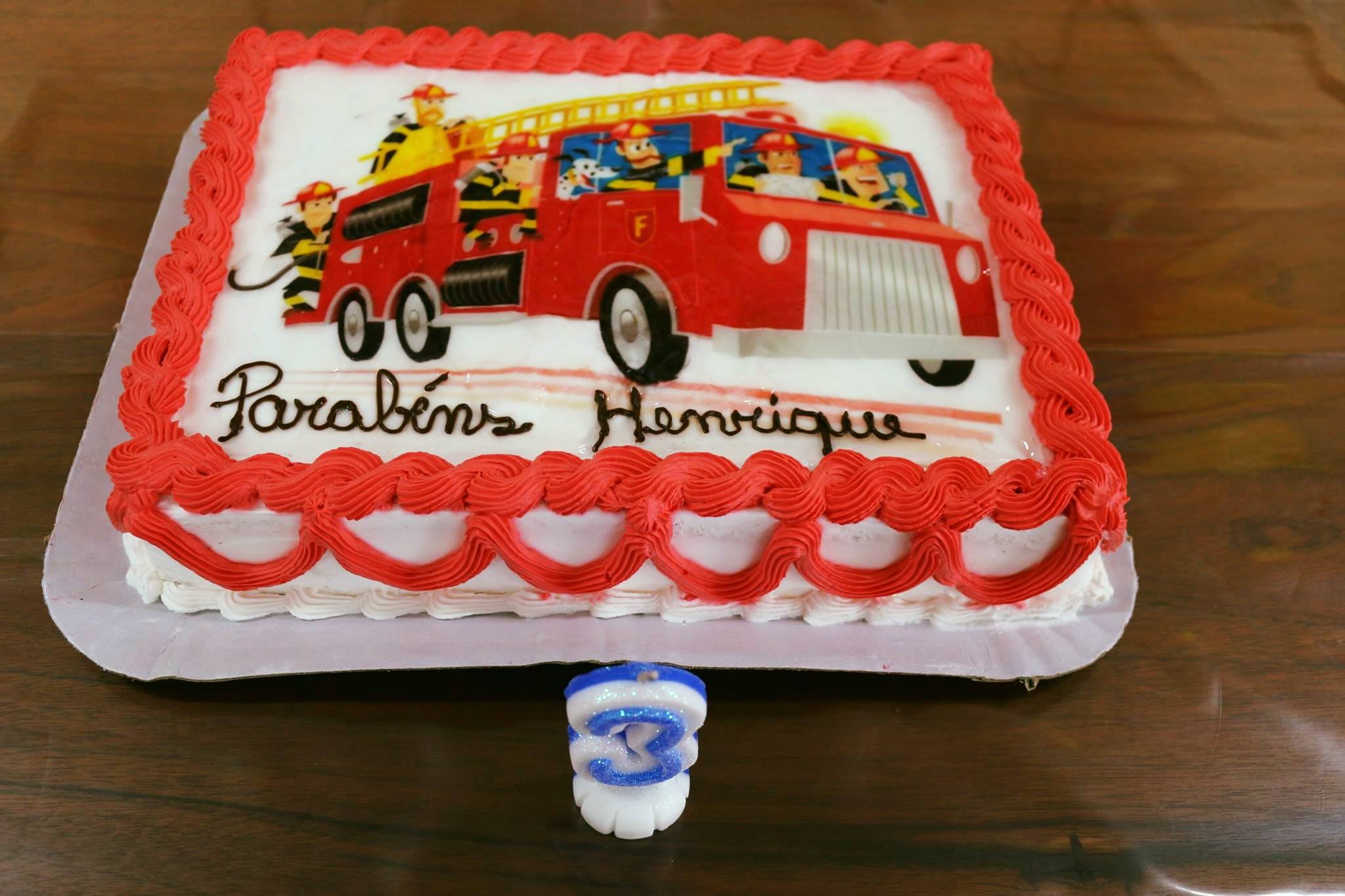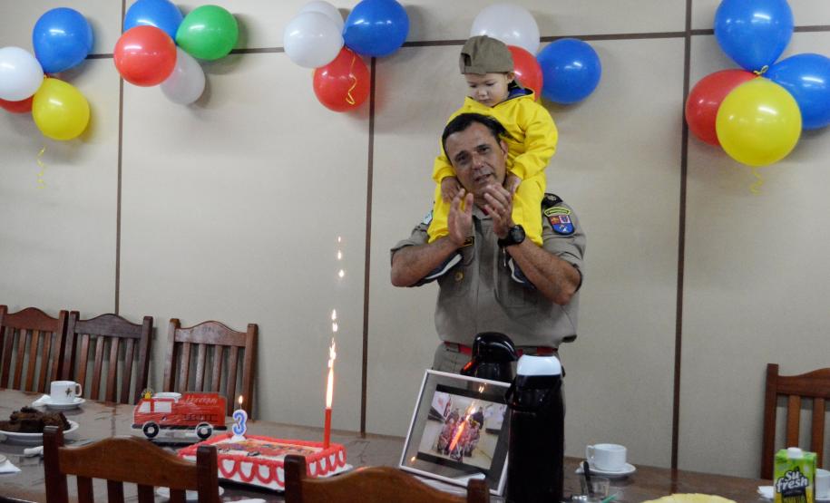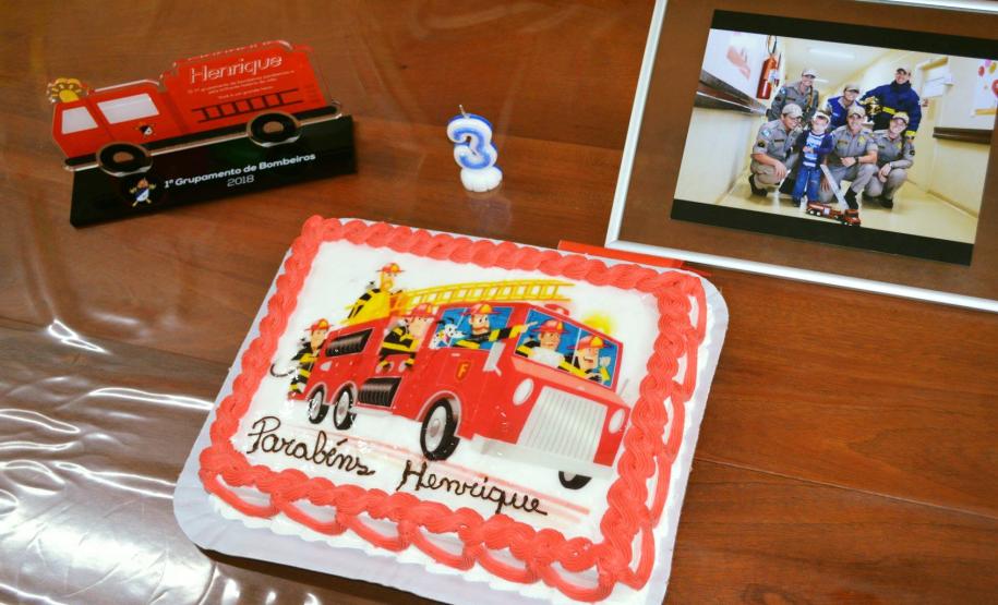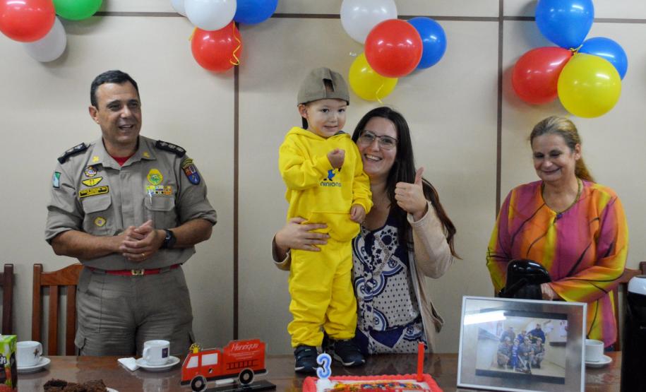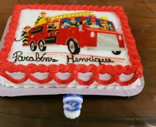 Ao final da visita, todos cantaram "parabéns" para comemorar os seus 3 anos de vida, com direito a bolo personalizado do bombeiro e uma lembrancinha para materializar esse momento tão especial.