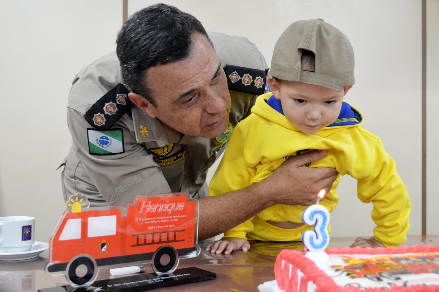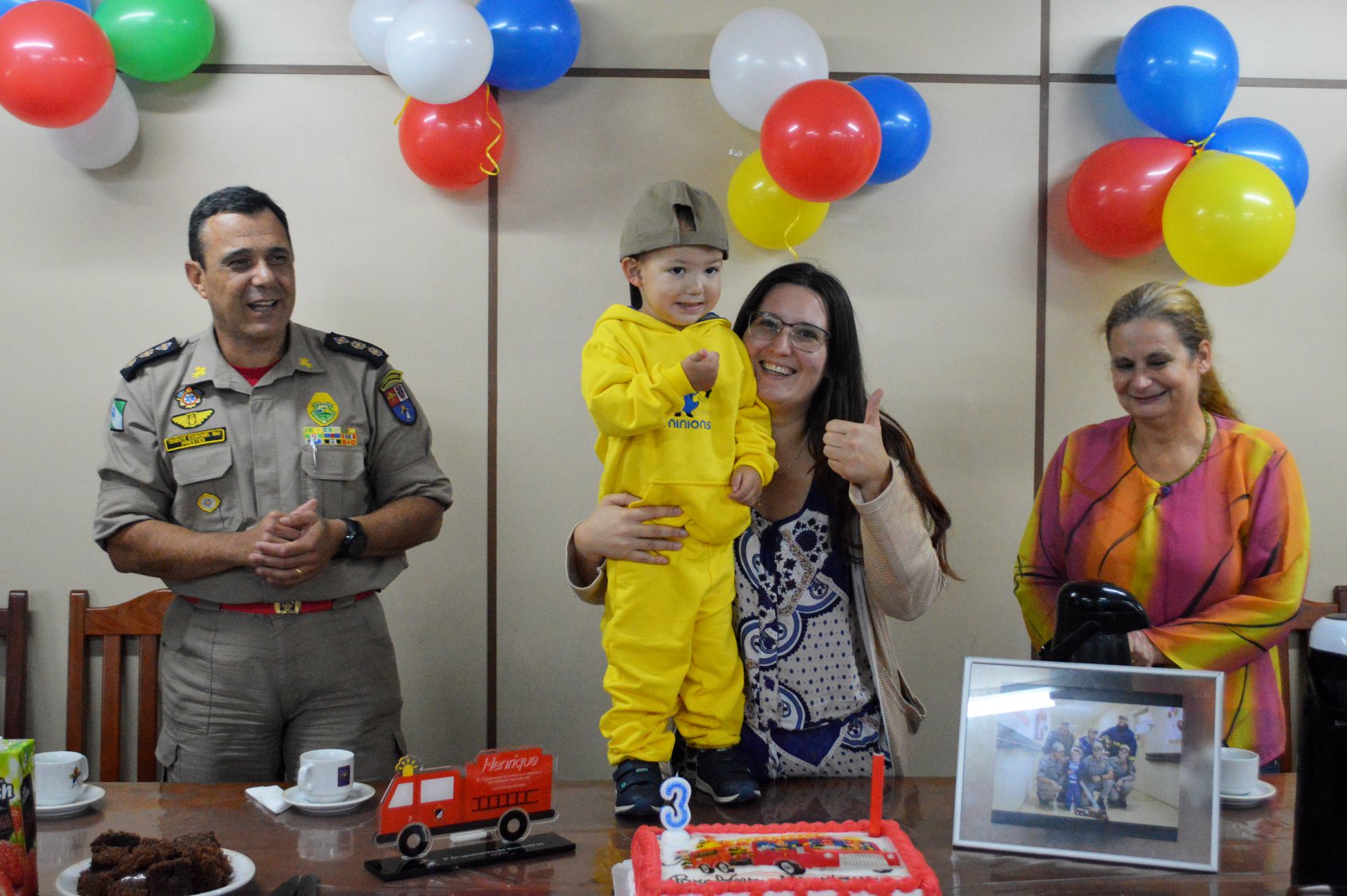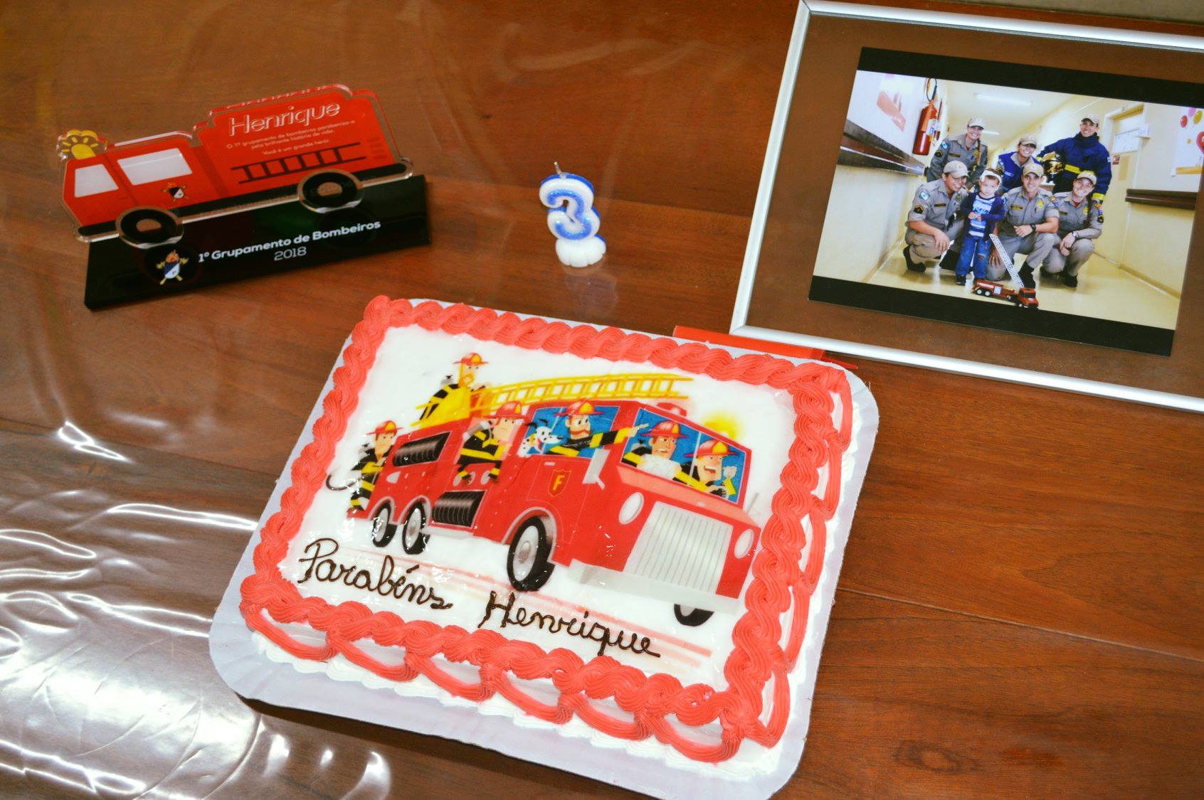 Ao final da visita, todos cantaram "parabéns" para comemorar os seus 3 anos de vida, com direito a bolo personalizado do bombeiro e uma lembrancinha para materializar esse momento tão especial.