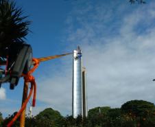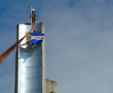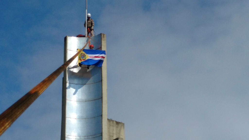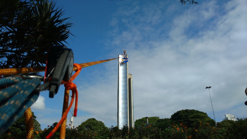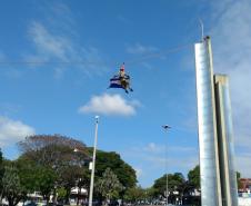 Em seguida, os alunos do CFSd 2016 de Umuarama montaram um sistema de salvamento em altura com uma tirolesa no obelisco monumental localizado também na Praça Santo Dumont onde realizaram a descida com a bandeira do município encerrando as atividades alusiva ao aniversário do CB Umuarama.