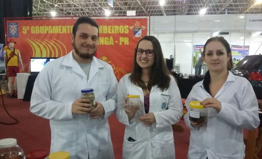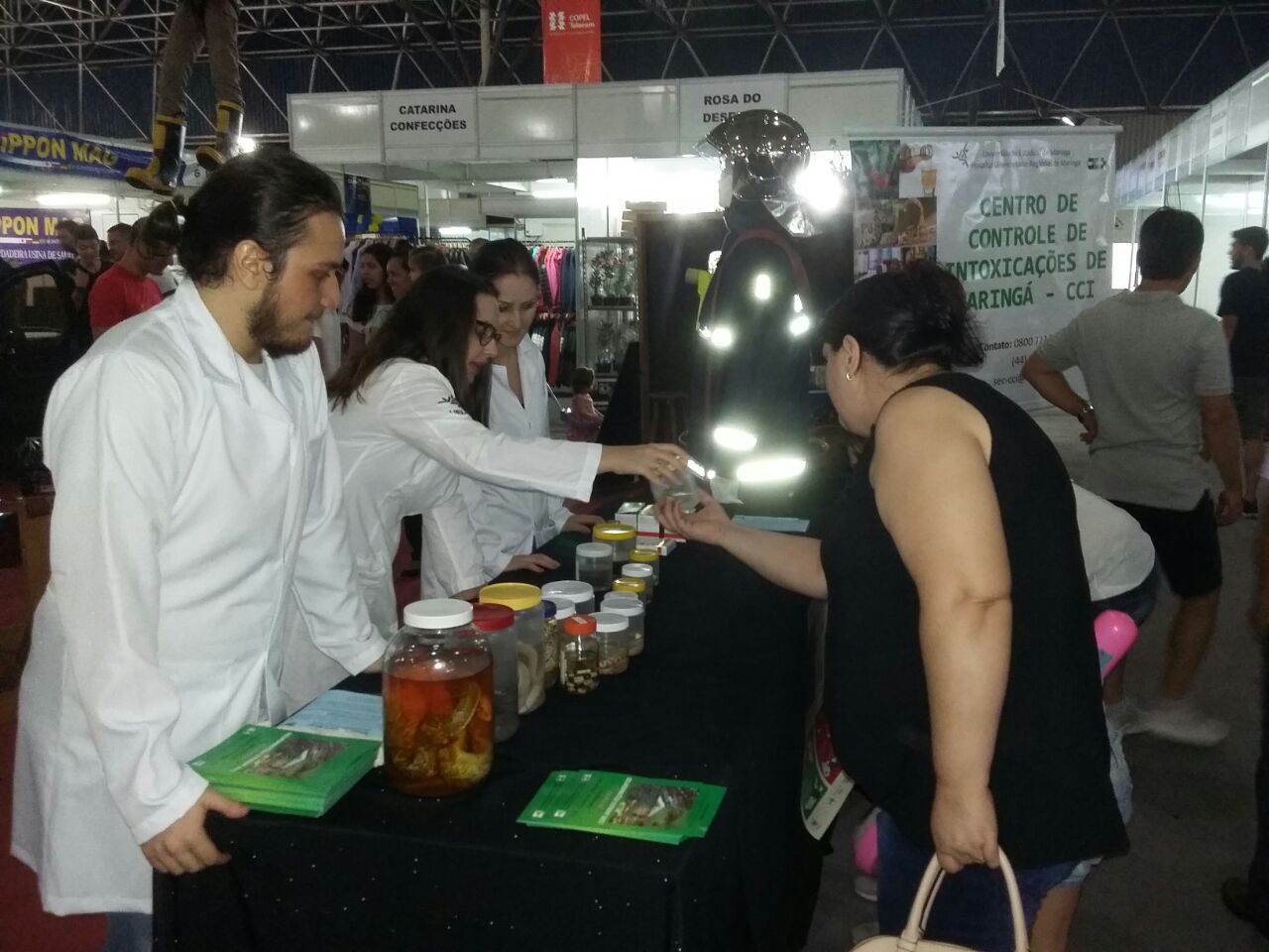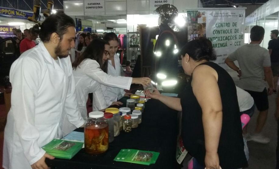 Nos dias 5 e 6 de maio, os visitantes do estande receberam orientações do Centro de Controle de Intoxicações da UEM/HU, sobre como proceder em casos de incidentes envolvendo contato com animais peçonhentos e puderam ver de perto aranhas, escorpiões e cobras.