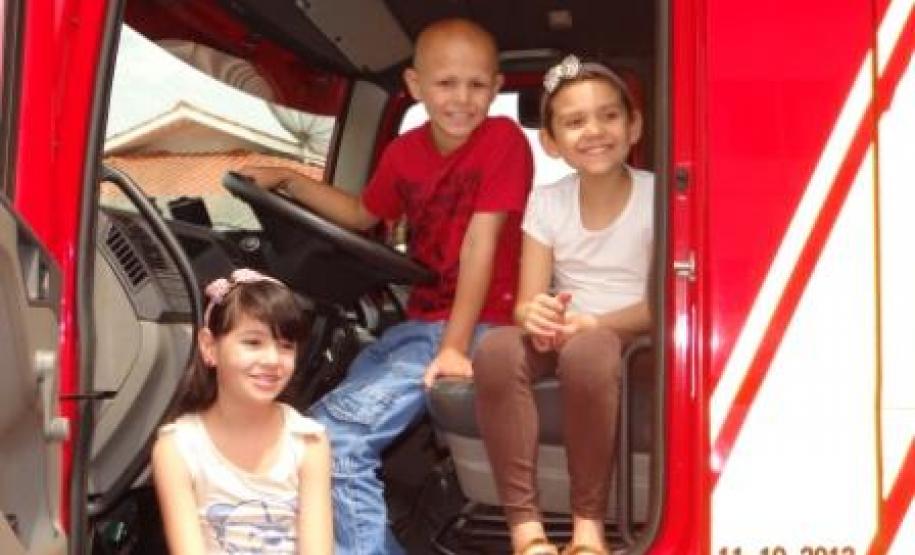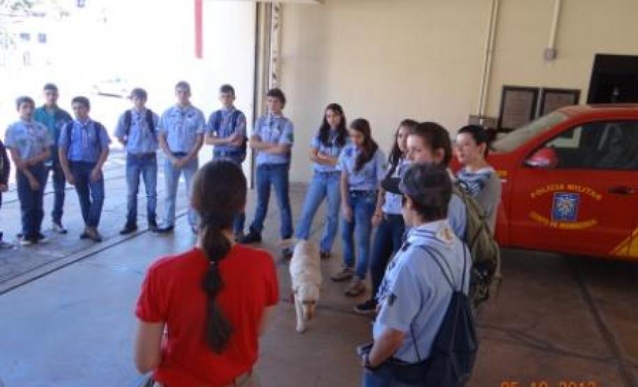 Juntamente com a equipe de Bombeiros Militares, um integrante do Canil/4°GB aguardava as crianças para recepcioná-las com a cadela Lili, que realiza atividades de busca de pessoas desaparecidas na área de circunscrição do 4°GB.