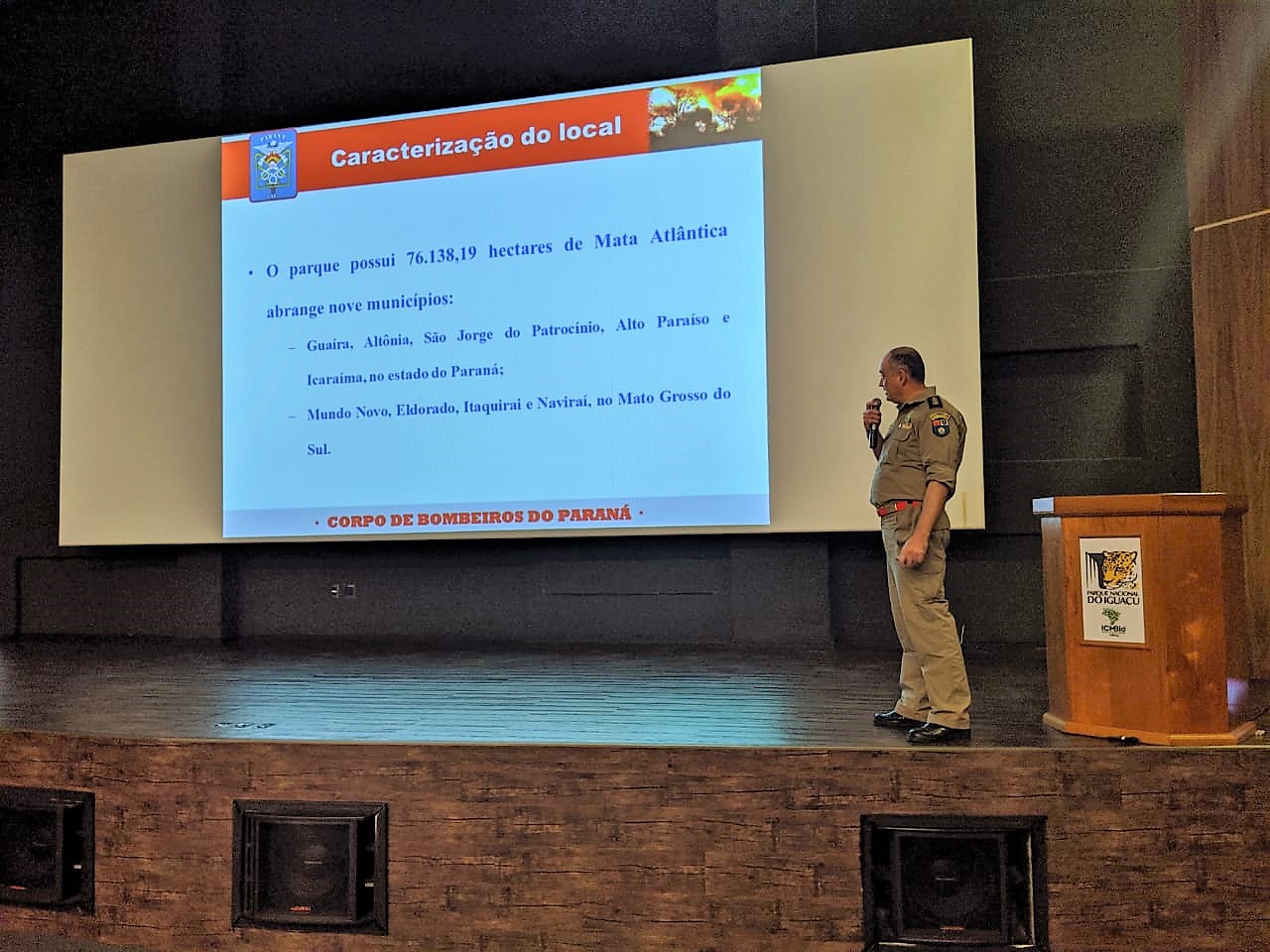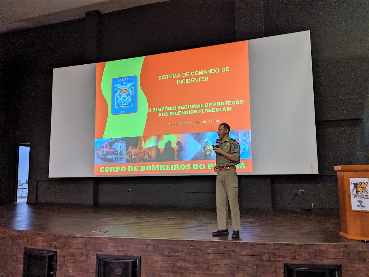O comandante do 4º Grupamento de Bombeiros, Major QOBM Rogério Lima de Araújo, ministrou palestra sobre Sistema de Comando de Incidentes no II Simpósio Regional de Proteção a Incêndios Ambientas realizado na data de hoje no Parque Nacional do Iguaçu.
