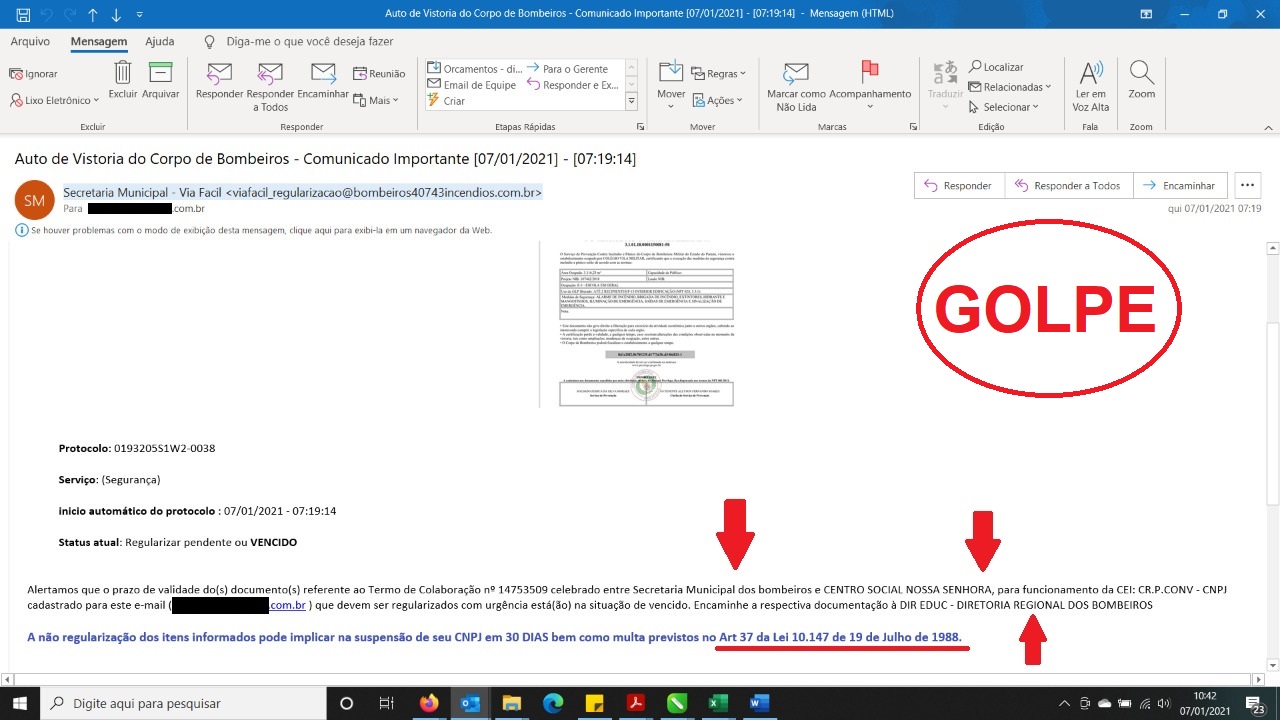 Quartel Central do 5ºGB, 25/01/2021 - Chegou ao conhecimento do 5°Grupamento, através de denúncia, a aplicação de um golpe envolvendo a instituição do Corpo de Bombeiros. É enviado para cidadãos responsáveis por estabelecimentos comerciais um e-mail informando falsas pendências no cadastro da empresa, requisitando documentação para a regularização junto ao Corpo de Bombeiros, sob pena de multa e suspensão do CNPJ.