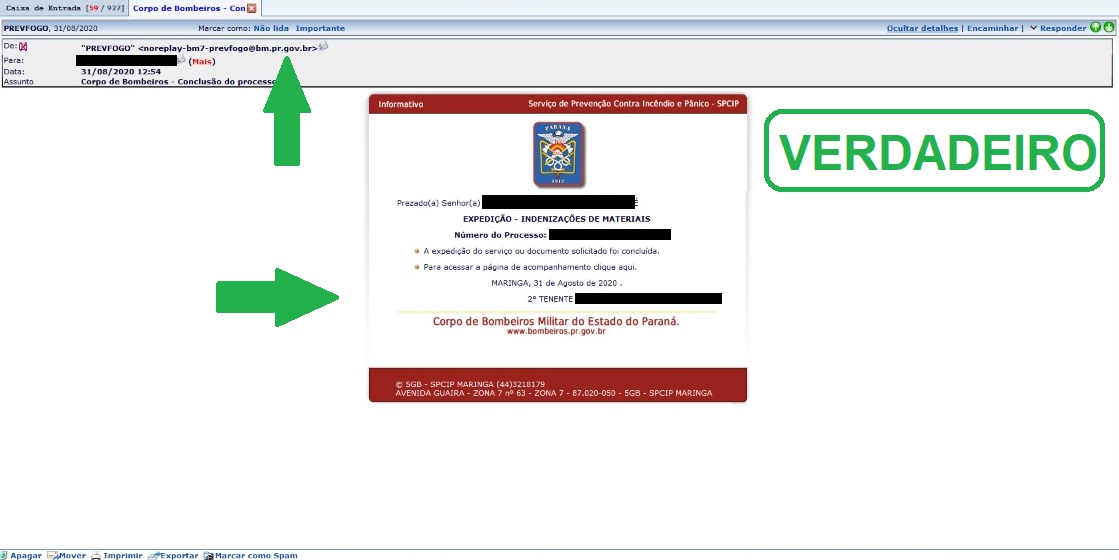 O Corpo de Bombeiros Militar não estabelece contato para informar pendências, pois cabe exclusivamente ao interessado o controle. E-mails serão enviados apenas em resposta ao andamento de protocolos iniciados pelo interessado, e sempre oriundos dos domínios @bm.pr.gov.br ou @pm.pr.gov.br. Por isso, preste atenção no endereço do remetente. Não seja enganado.