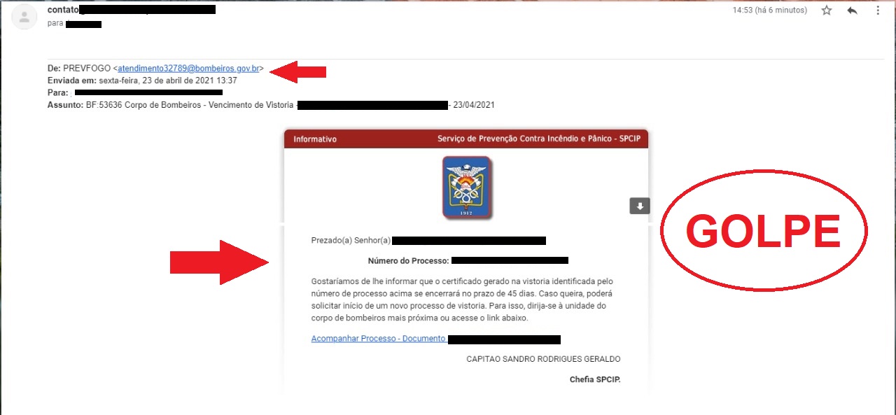 Quartel Central do 5ºGB, 26/04/2021 - Novamente, o 5°Grupamento tomou conhecimento da continuidade de golpes que envolvem o nome do Corpo de Bombeiros. As denúncias dão conta de que é enviado aos cidadãos responsáveis por estabelecimentos comerciais um e-mail com falsas pendências no cadastro da empresa, requisitando documentação para a regularização junto ao Corpo de Bombeiros, sob pena de multa e suspensão do CNPJ.