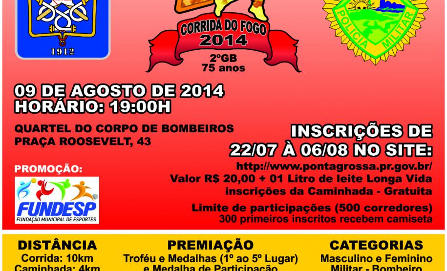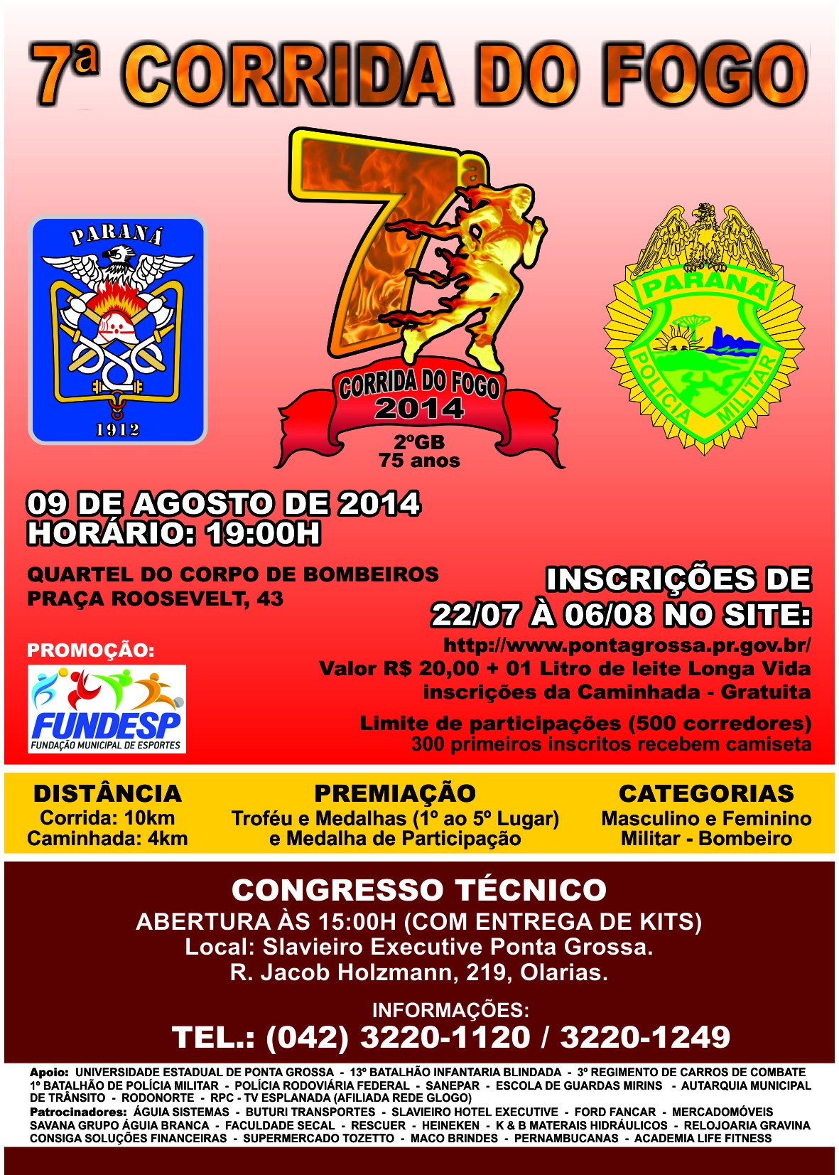 Comemorando os 75 anos do 2º Grupamento de Bombeiros e os 160 anos da Polícia Militar do Paraná, o Corpo de Bombeiros de Ponta Grossa, em parceria com a Prefeitura Municipal, organizará a 7ª Corrida do Fogo, evento que tornou-se tradicional na cidade. A prova é uma corrida noturna, pelas ruas do centro de Ponta Grossa, a ser realizada no dia 9 de agosto de 2014, com largada à frente do Quartel Central do 2º GB, às 19h00min.