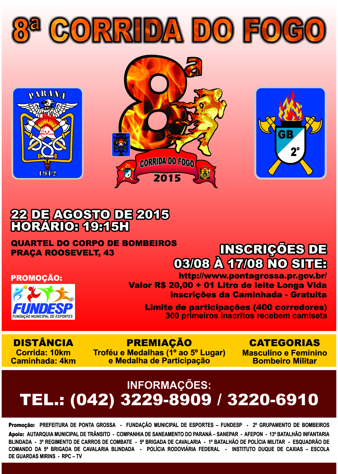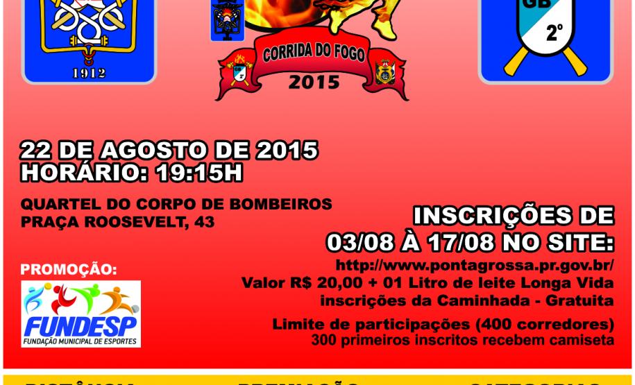Comemorando os 76 anos do 2º Grupamento de Bombeiros e os 161 anos da Polícia Militar do Paraná, o Corpo de Bombeiros de Ponta Grossa, em parceria com a Prefeitura Municipal, organizará a 8ª Corrida do Fogo, evento que tornou-se tradicional na cidade. A prova é uma corrida noturna, pelas ruas do centro de Ponta Grossa, a ser realizada no dia 22 de agosto de 2015, com largada à frente do Quartel Central do 2º GB, às 19h15min.