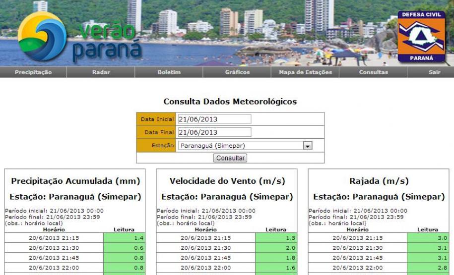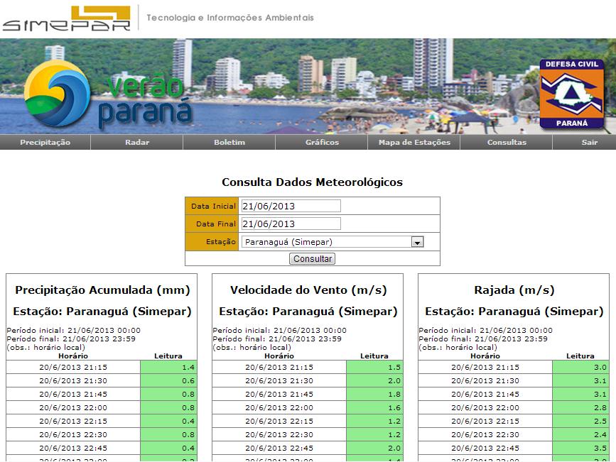 Desta forma, dados como precipitação/chuva (em “milímetros” - estações pluviométricas e meteorológicas), nível de rio (em “metros” – estações hidrológicas) e vento (em “metros por segundo” – estações meteorológicas) podem ser acessados via Internet com atualizações a cada 15 (quinze) minutos.