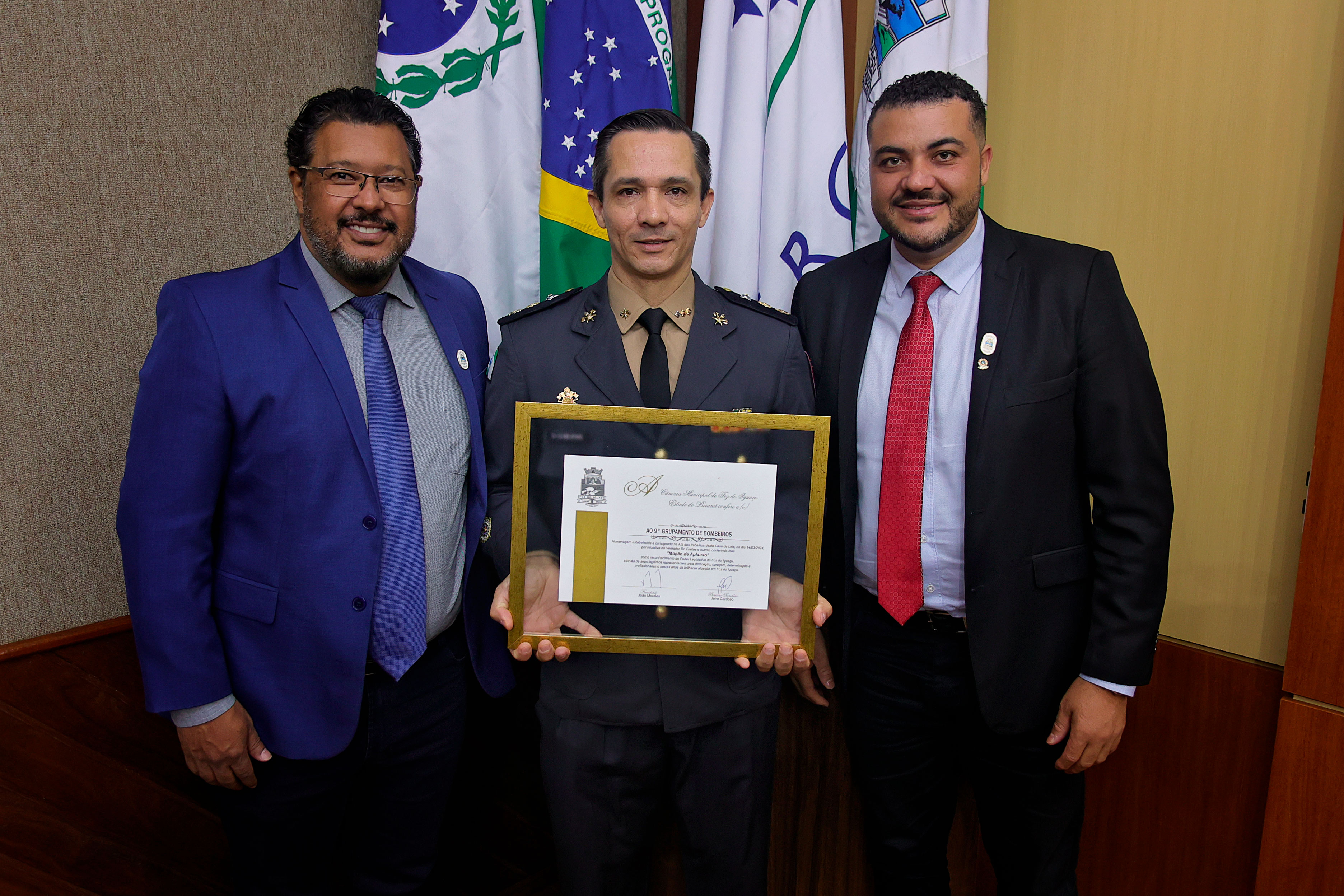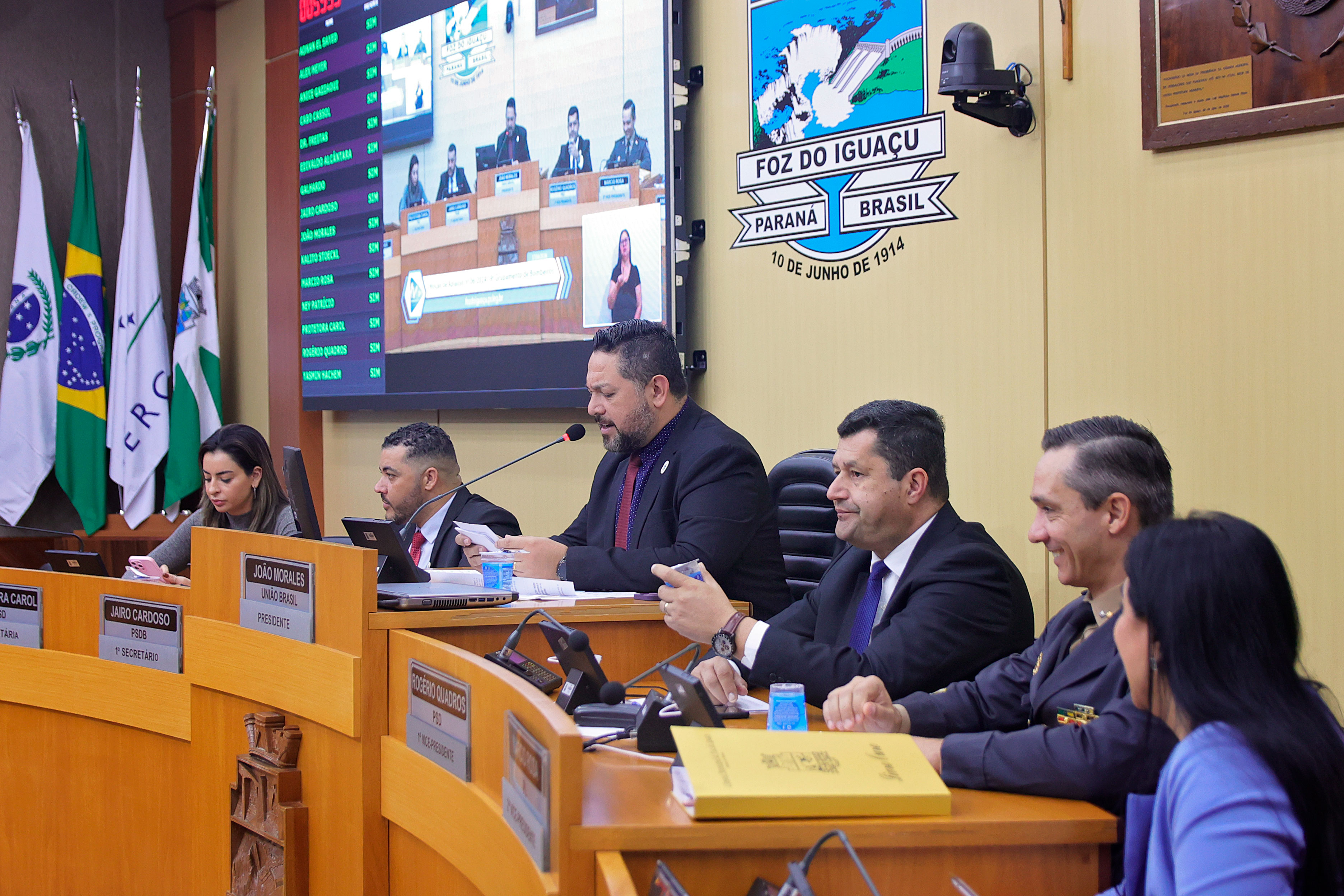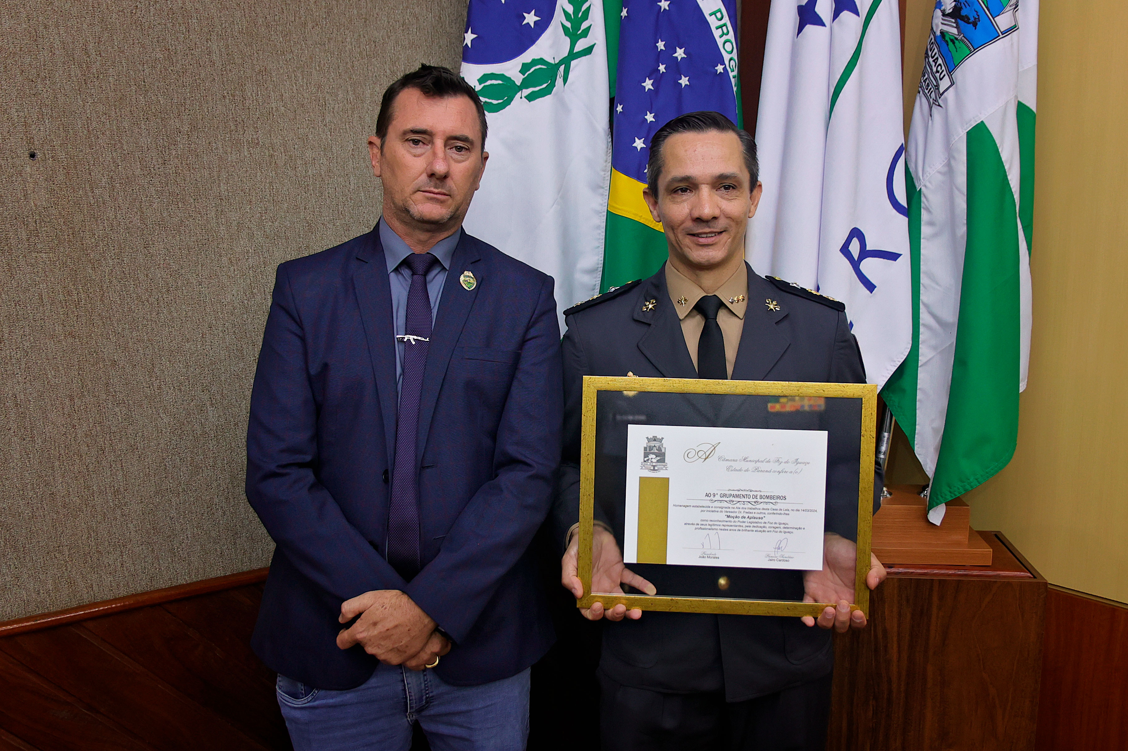O Ten.-Cel. Edson Leonel Rodrigues, Comandante da Unidade, recebeu a placa da moção das mãos do parlamentar e do presidente daquela casa legislativa, vereador João Morales em “reconhecimento do poder legislativo de Foz do Iguaçu à dedicação, coragem, determinação e profissionalismo de todo o efetivo nestas quase três décadas de brilhante atuação”.