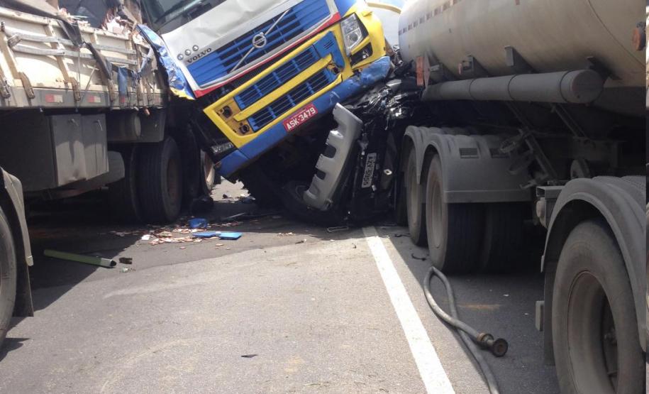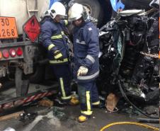 Após a saída de todas as vítimas, foi dado início ao processo de desencarceramento de um senhor, aproximadamente 45 anos, que se encontrava em óbito, com seu carro prensado entre dois caminhões.