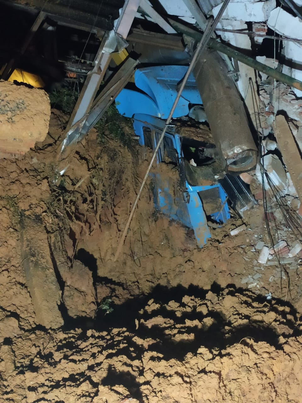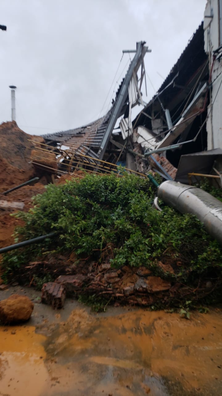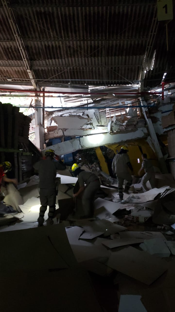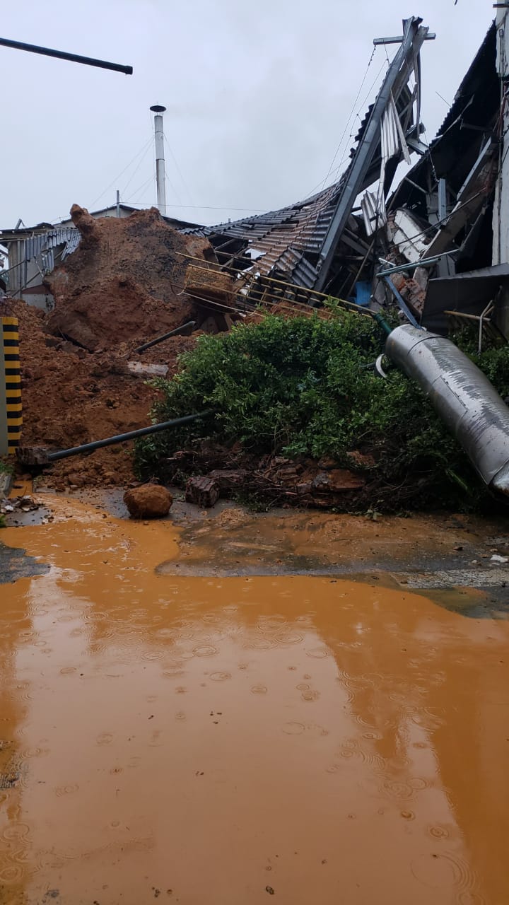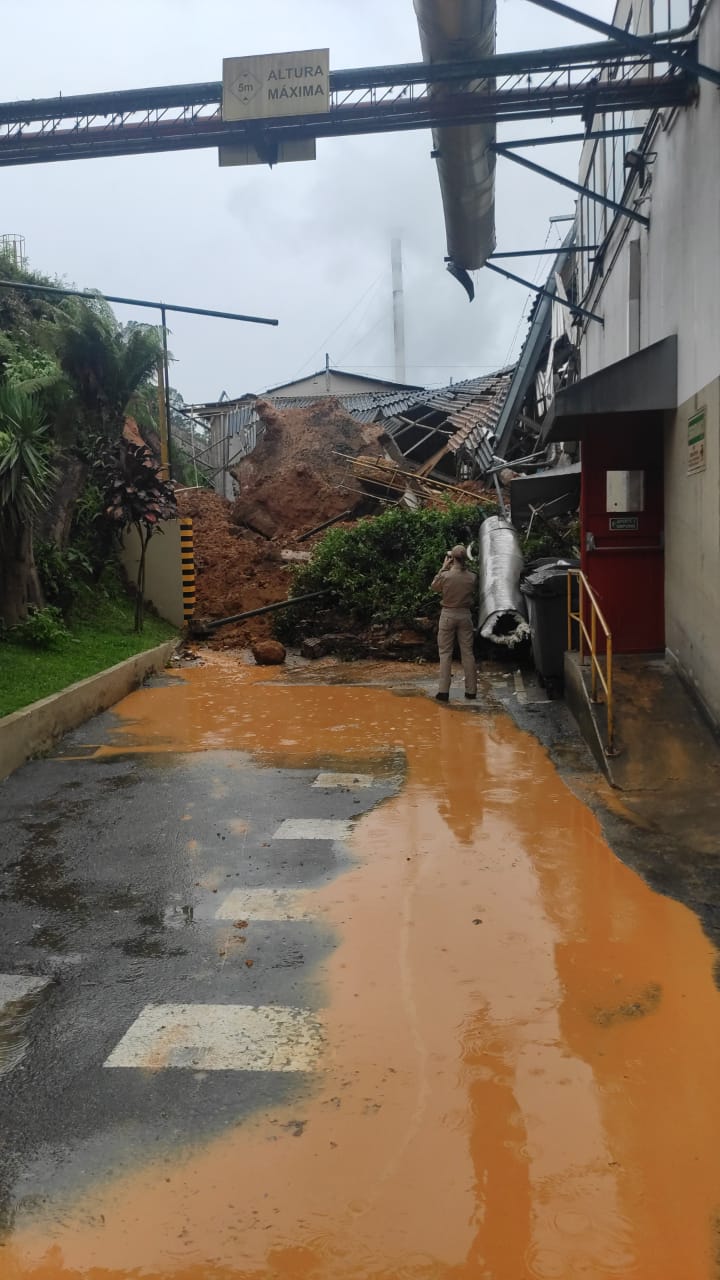 Por volta das 17 horas, um deslizamento de terra colapsou a estrutura de um barracão nas dependências da empresa Trombini Embalagens, destruindo uma caixa d’água e soterrando um caminhão e um trabalhador que prestava serviço no interior do barracão.