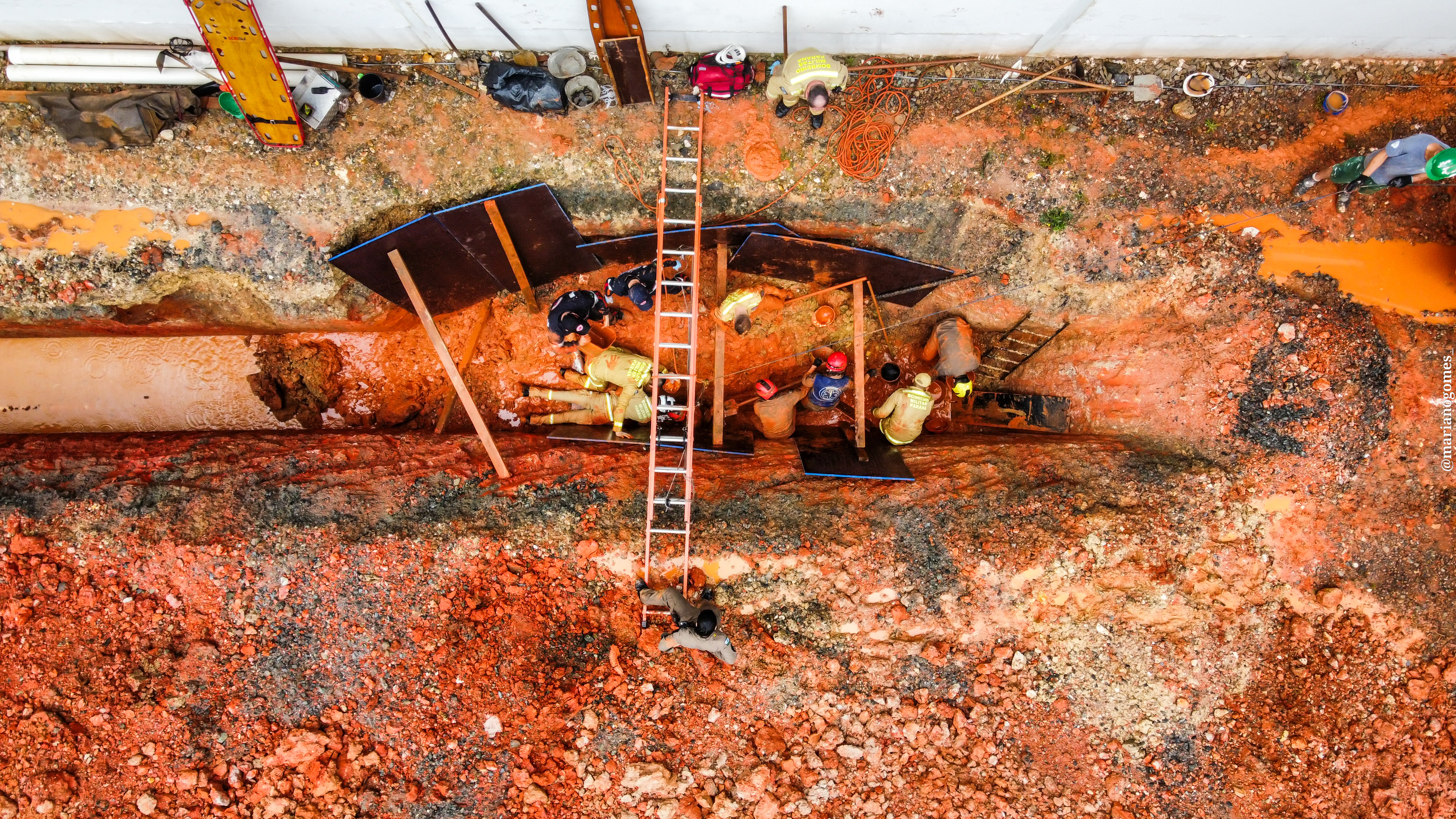 Na tarde desta quarta-feira, 22 de janeiro, as equipes do 7º Batalhão de Bombeiro Militar realizaram uma operação para resgatar dois trabalhadores soterrados em uma vala de aproximadamente dois metros de profundidade em Colombo.