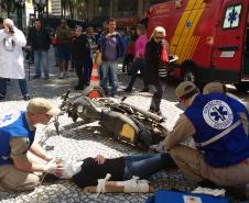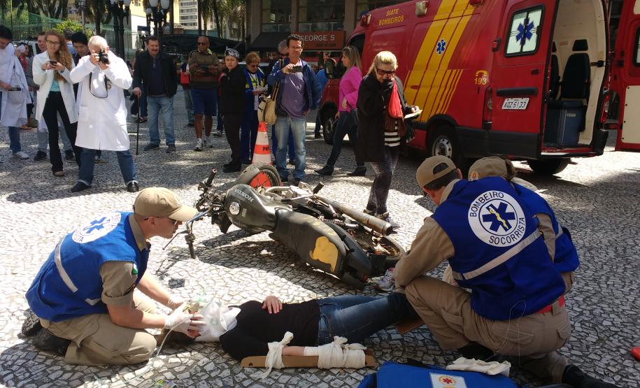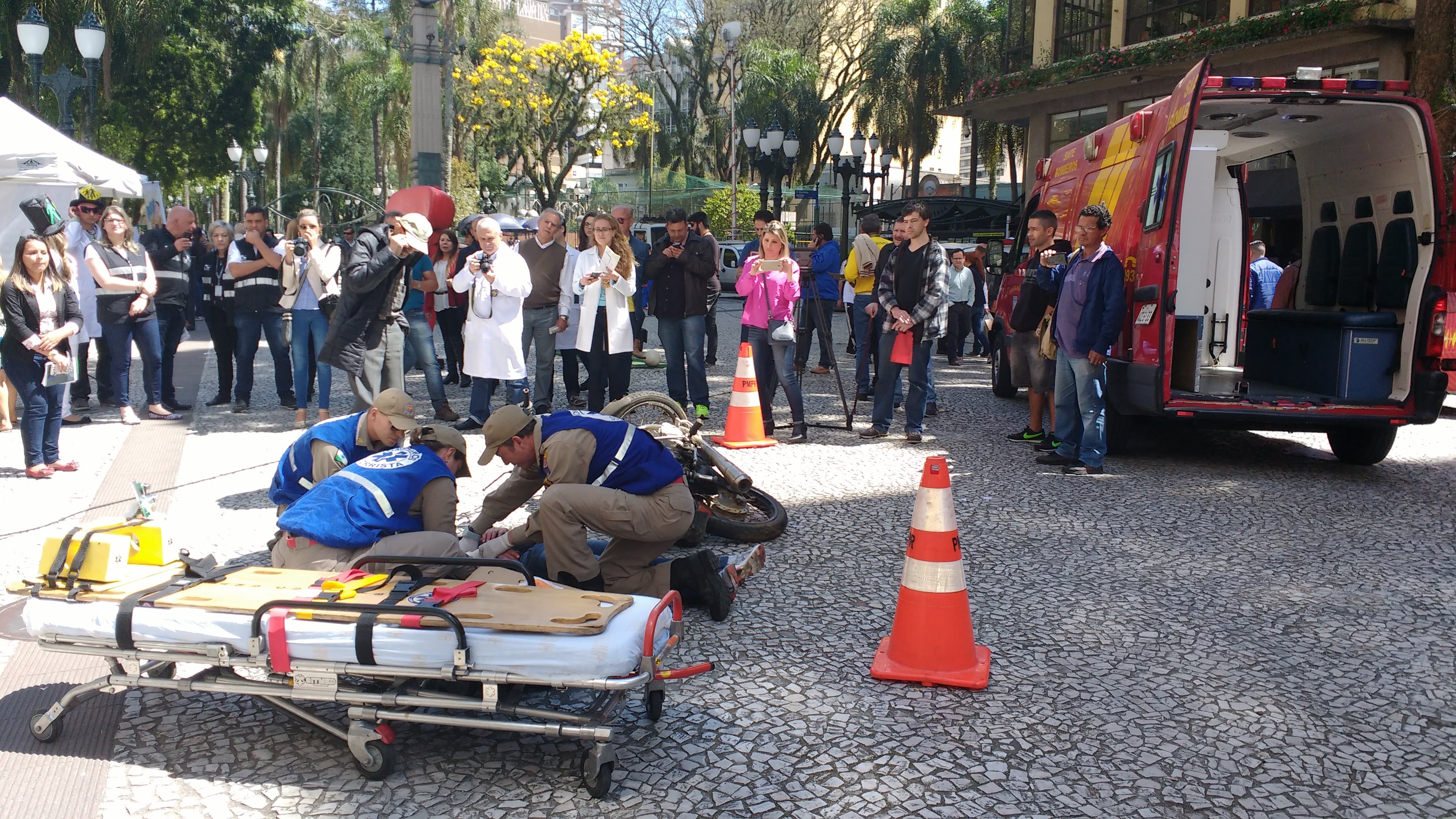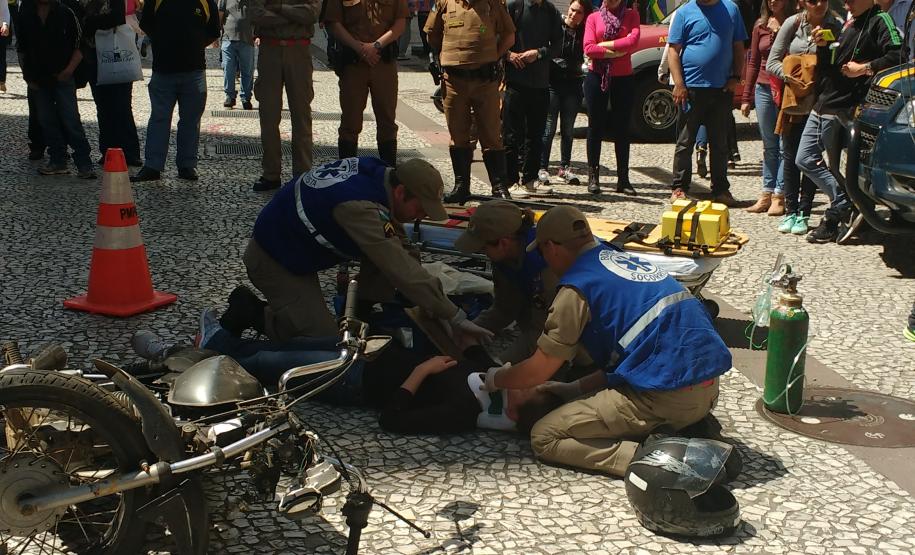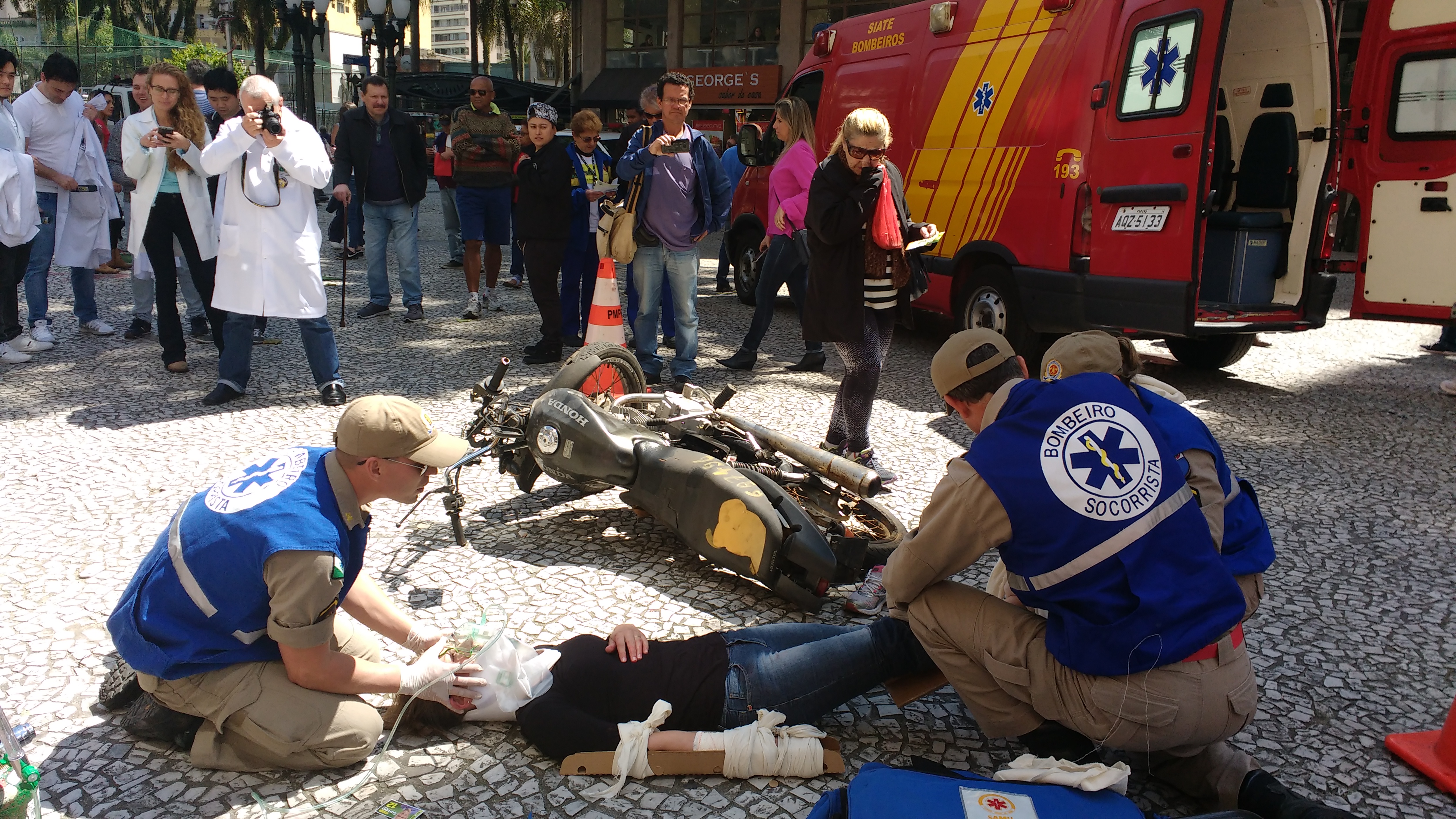Houve o simulado de um atendimento a uma vítima que sofreu um acidente de moto, a qual apresentava lesões graves em membro inferior e superior.
