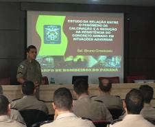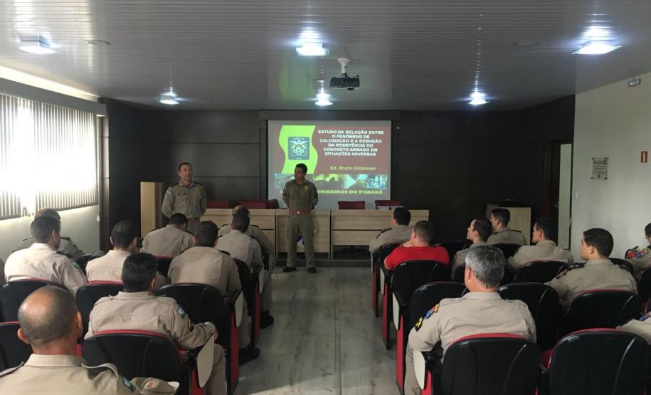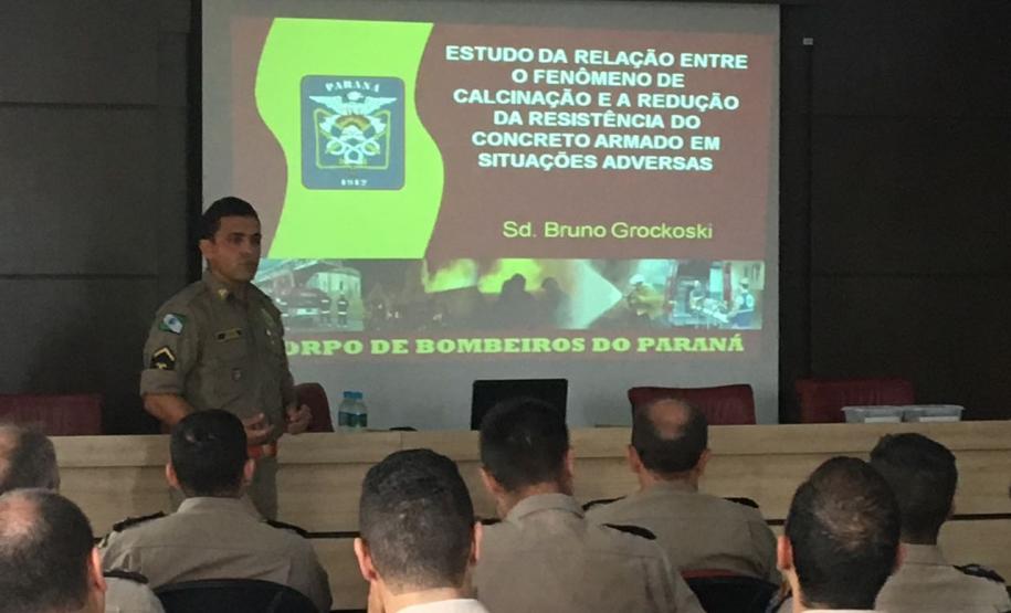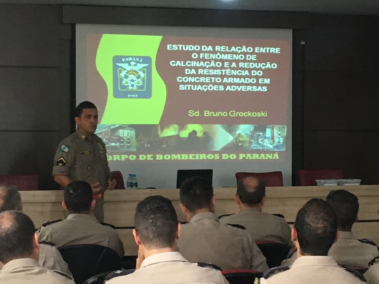 Na sequência o Soldado Bruno Grockoski, pertencente ao Posto de Bombeiros de Rio Negro, palestrou sobre seu Trabalho Científico com o Tema “Estudo da Relação Entre o Fenômeno de Calcinação e a Redução da Resistência do Concreto Armado em Situações Adversas”, no qual recebeu premiação no SENABOM 2017, em João Pessoa, por ter sido eleito um dos 5 melhores artigos apresentados no evento.