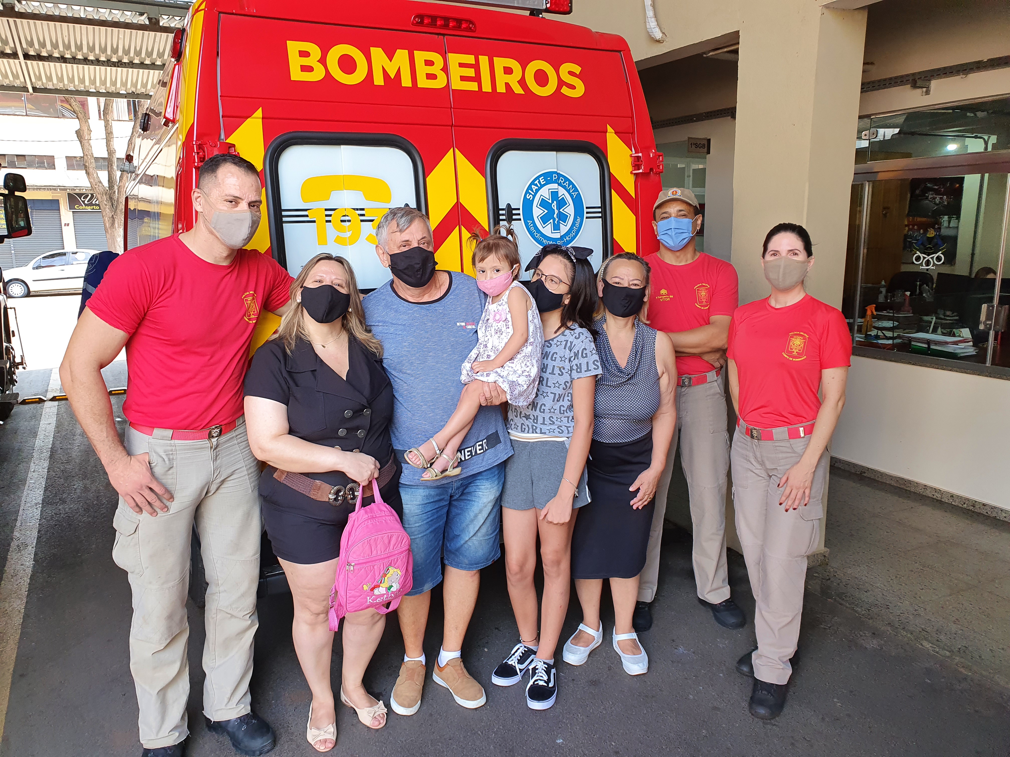 Quartel Central do 5ºGB, 14/10/2020 - Hoje (14), o Quartel Central dos Bombeiros de Maringá recebeu a ilustre visita da pequena Ketlen Ferreira e seus familiares. A garotinha de apenas três anos foi salva pelo Corpo de Bombeiros, em colaboração com a equipe do Samu, no dia 29 do mês passado, após se afogar em uma piscina.