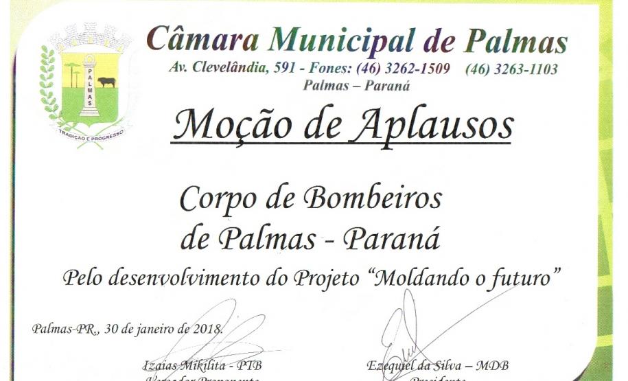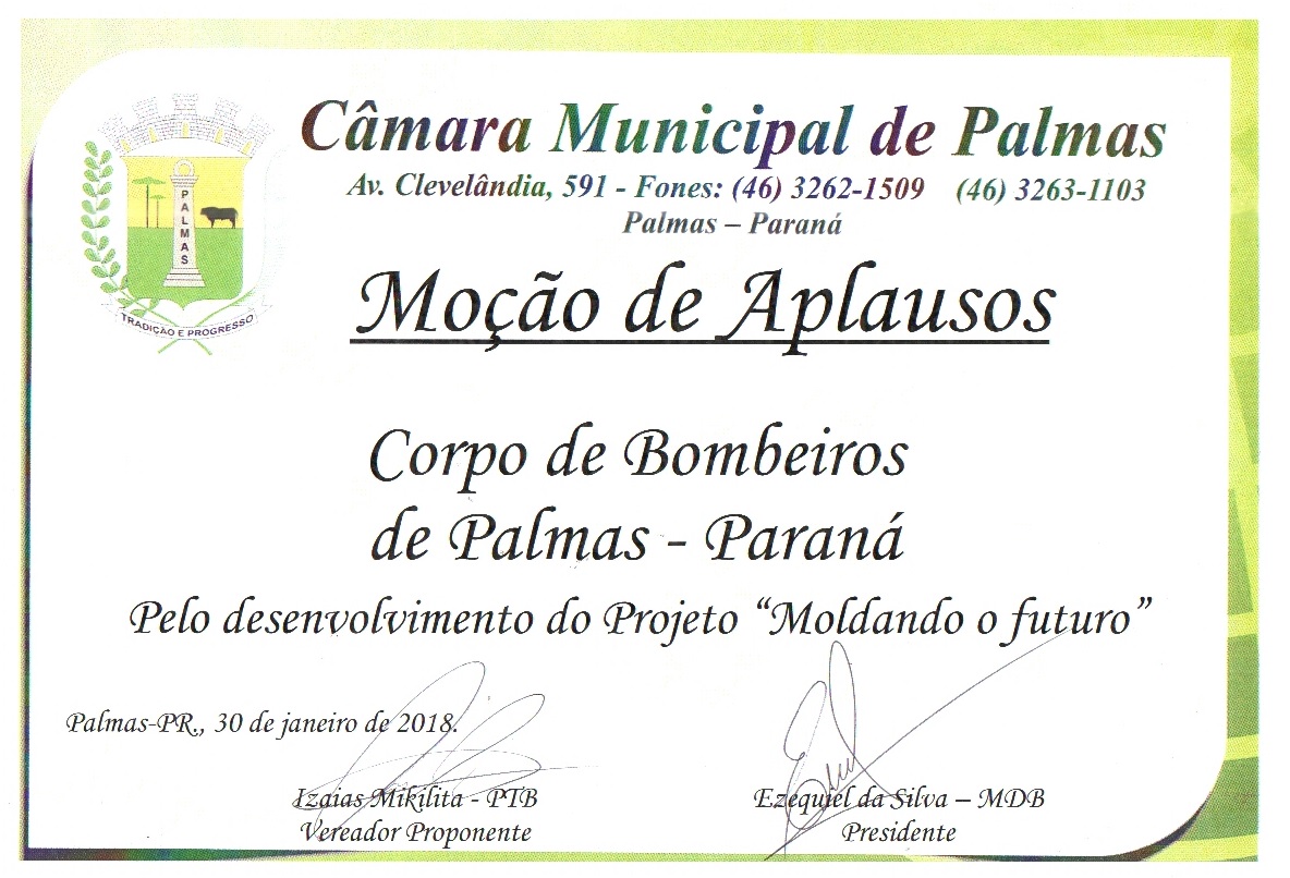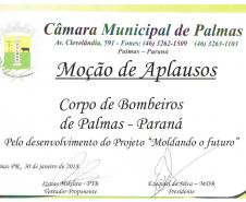 Nesta segunda-feira (05), os bombeiros militares da Guarnição de Bombeiros de Palmas, receberam na primeira Sessão da Câmara Municipal de Palmas a Moção de Aplausos referente ao projeto “Moldando o Futuro”, o qual teve início no ano de 2017. O projeto proporcionou, para cerca de 1,2 mil estudantes de 58 turmas do 5º ao 9º ano das redes pública e privada de ensino, visitas em que puderam conhecer as instalações do Corpo de Bombeiros de Palmas, no Sudoeste do Paraná.