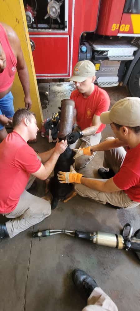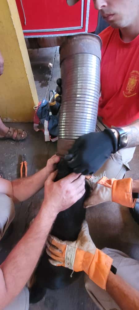 Às 10h40min desta sexta-feira (06), o Corpo de Bombeiros em Maringá foi acionado pessoalmente pelo Sr. Gabriel, que foi até o quartel na praça Geoffrey Wilde Diment, no Maringá Velho. Ele encontrou a mascote Neguinha com a cabeça presa em um tubo metálico na oficina mecânica em que ela mora.
