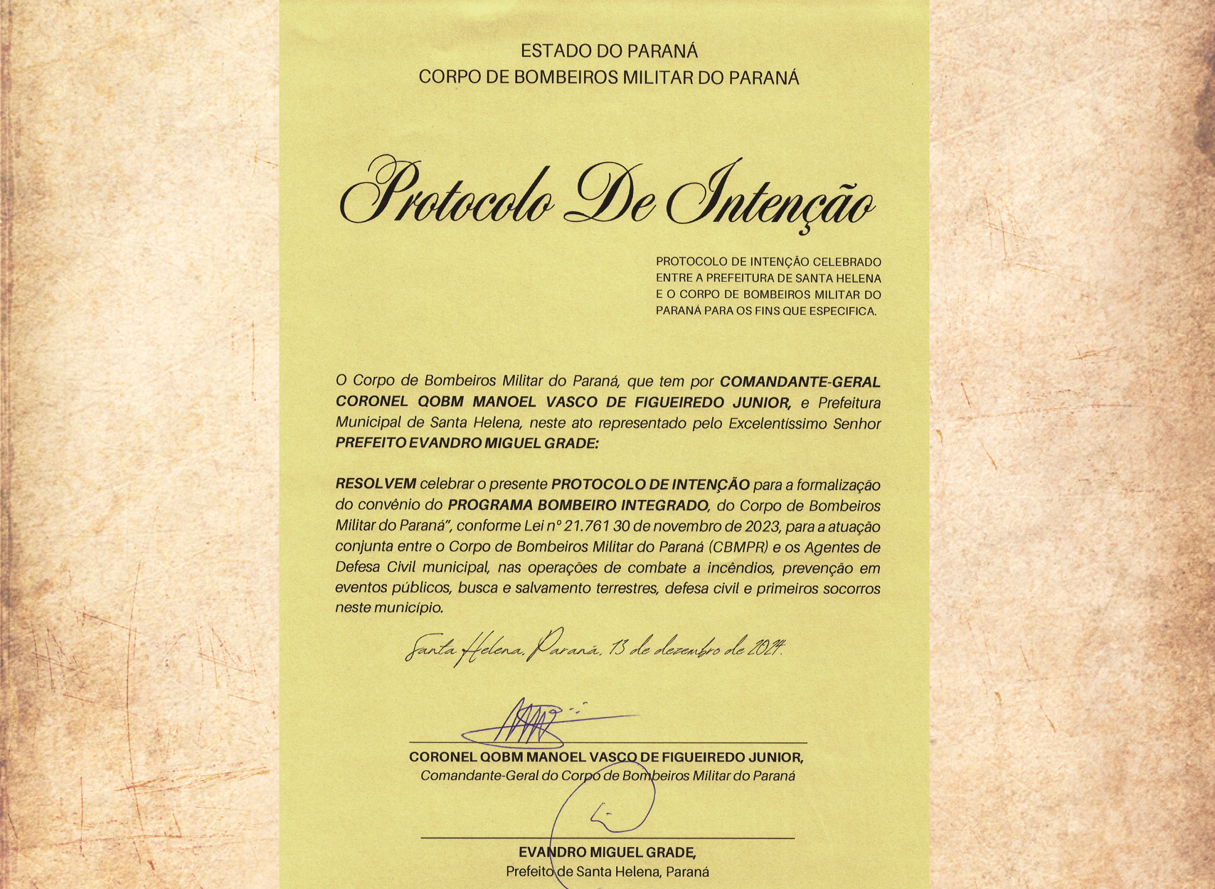 Durante a cerimônia, o prefeito da cidade e o Comandante-Geral do CBMPR assinaram um protocolo de intenção para a formalização do convênio do “Programa Bombeiro Integrado”, que prevê a atuação conjunta entre bombeiros militares e agentes de defesa civil municipais nas operações de combate a incêndios, salvamentos, socorros públicos e atividades de defesa civil na cidade de Santa Helena.