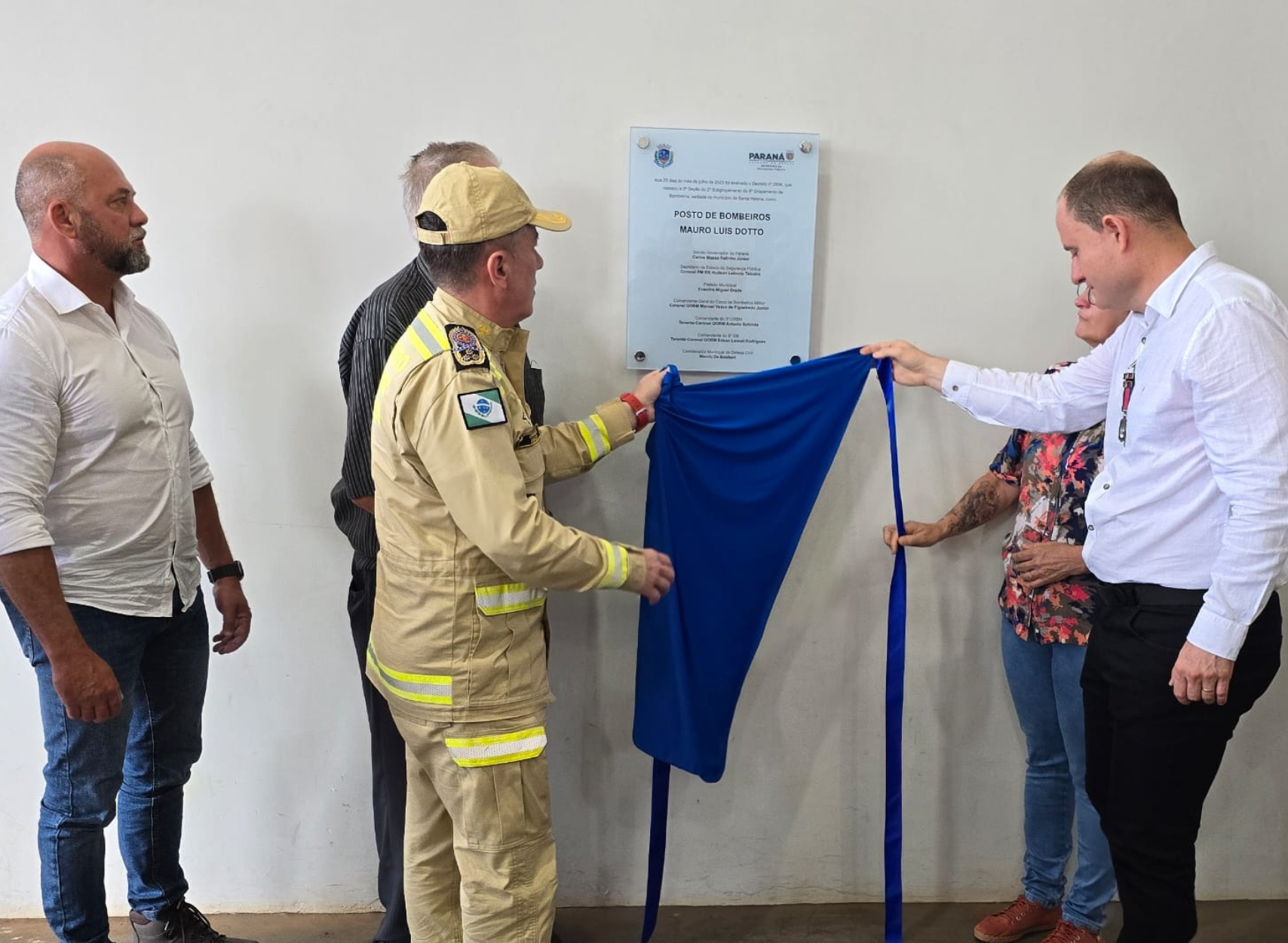 Como ato final, com a presença de familiares, tivemos o emocionante descerramento da placa que denomina as instalações do Corpo de Bombeiros de Santa Helena, como POSTO DE BOMBEIROS “MAURO LUIS DOTTO”, em reconhecimento ao grande trabalho desenvolvido em vida, lutando pela causa pública.