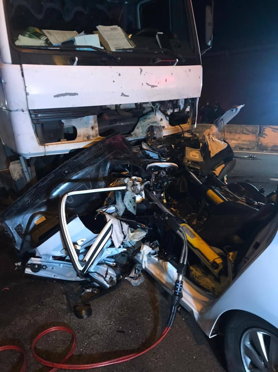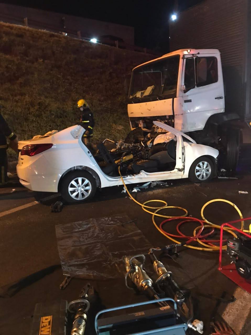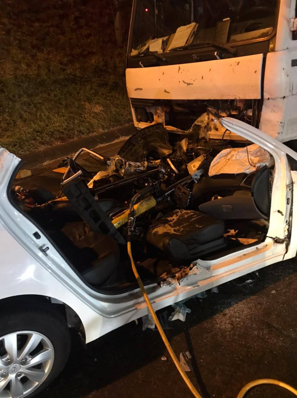 Quartel Central do 5ºGB (08/07/2021) - No início da noite desta quarta-feira (08), ocorreu uma colisão frontal entre um carro HB20 e um caminhão na PR-317. O choque entre os veículos danificou o carro deixando o motorista preso às ferragens, classificado como encarceramento Tipo Físico II.
