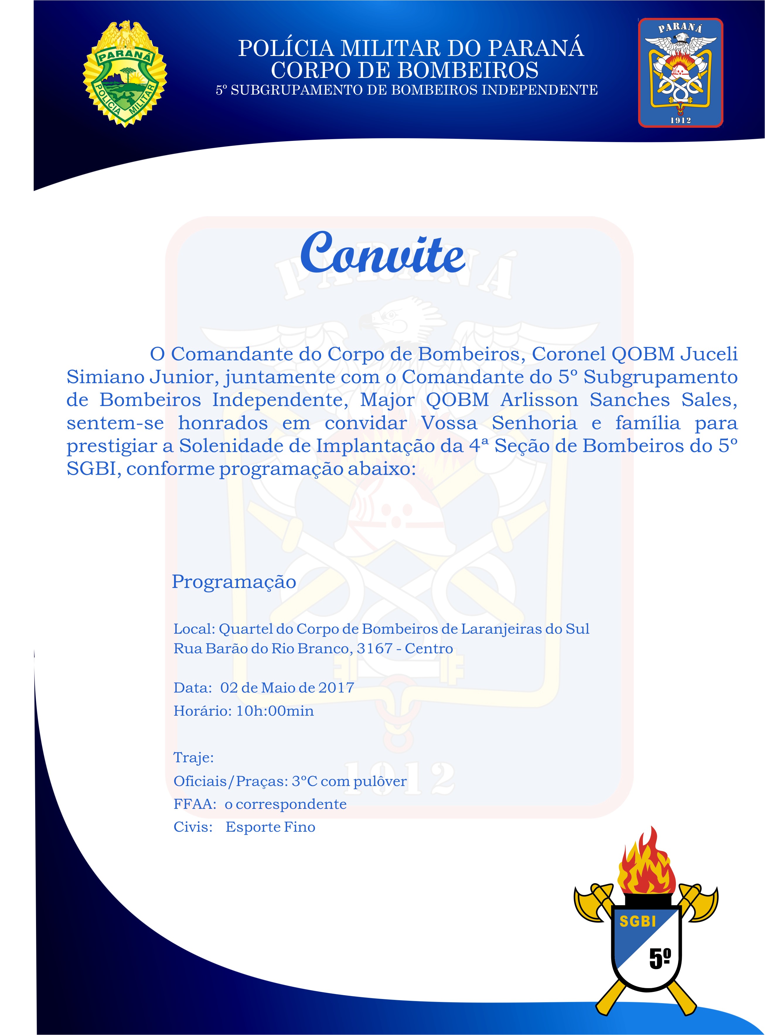 5º CIBM - Paranavaí Convite 28/04/2017 - 17:12 Solenidade de Implantação da 4ª Seção de Bombeiros do 5º Subgrupamento de Bombeiros Independente. GALERIA DE IMAGENS Compartilhe: Voltar Início Imprimir Baixar