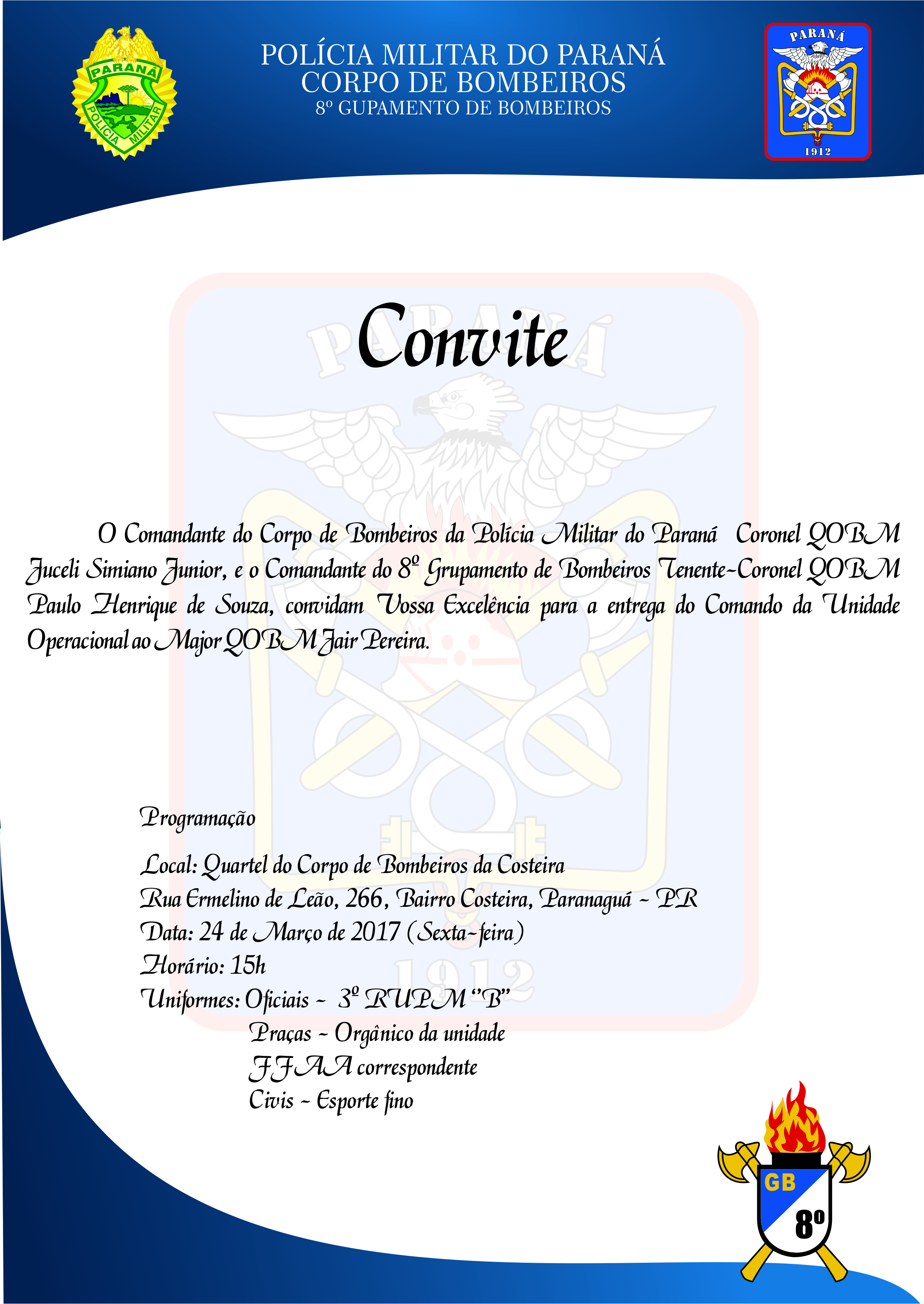 8º Batalhão de Bombeiro Militar - Paranaguá Convite da solenidade de passagem de comando do 8º GB - Paranaguá 16/03/2017 - 17:20 Convite da solenidade de passagem de comando do 8º Grupamento GALERIA DE IMAGENS Compartilhe: Voltar Início Imprimir Baixar