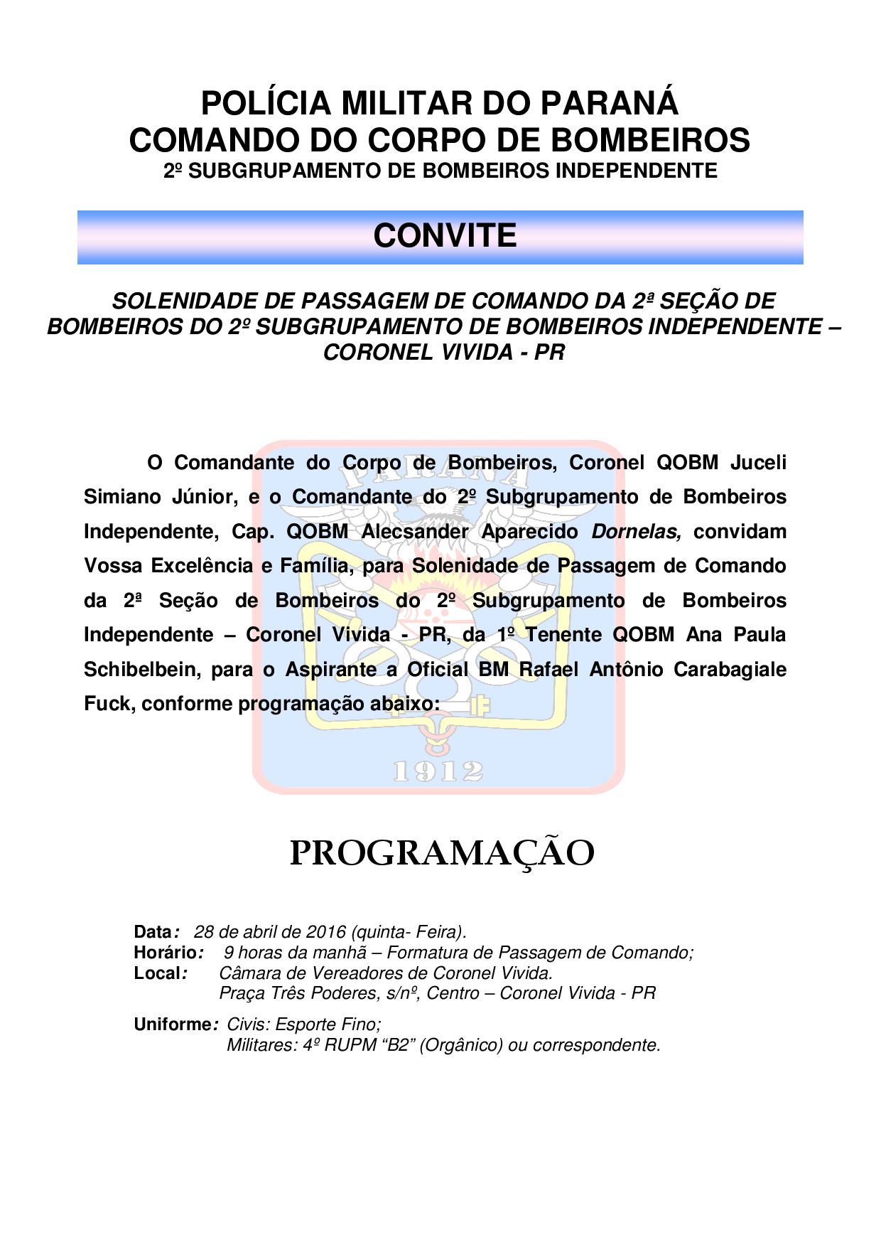 O Comandante do Corpo de Bombeiros, Coronel QOBM Juceli Simiano Júnior, e o Comandante do 2º Subgrupamento de Bombeiros Independente, Cap. QOBM Alecsander Aparecido Dornelas, convidam Vossa Excelência e Família, para Solenidade de Passagem de Comando da 2ª Seção de Bombeiros do 2º Subgrupamento de Bombeiros Independente – Coronel Vivida - PR, da 1º Tenente QOBM Ana Paula Schibelbein, para o Aspirante a Oficial BM Rafael Antônio Carabagiale Fuck, conforme programação abaixo: