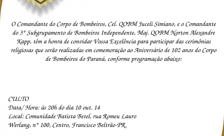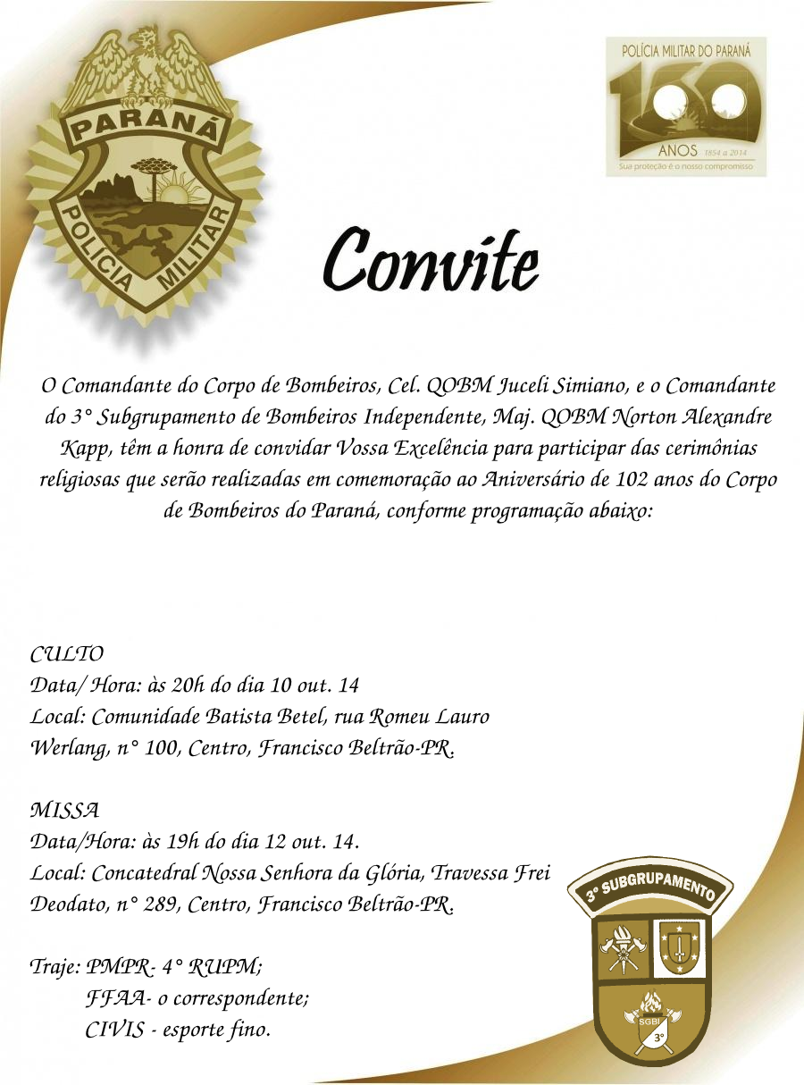 3º CIBM - Santo Antônio da Platina Convite para o Culto de Ação de Graças aos 102 anos do Bombeiros em Francisco Beltrão 10/10/2014 - 14:24 Convite para o Culto de Ação de Graças aos 102 anos do Bombeiros em Francisco Beltrão GALERIA DE IMAGENS Compartilhe: Voltar Início Imprimir Baixar