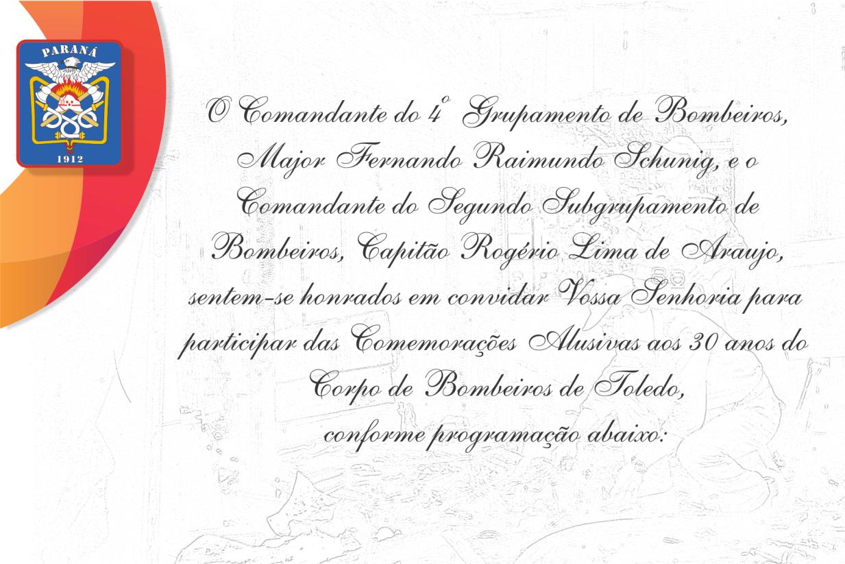 O Comandante do 4º Grupamento de Bombeiros, Major Fernando Raimundo Schunig, e o Comandante do 2º Subgrupamento de Bombeiros/4º GB, Capitão Rogério Lima de Araújo sentem-se honrados em convidar Vossa Senhoria para participar das comemorações alusivas aos 30 anos do Corpo de Bombeiros de Toledo, conforme programação: