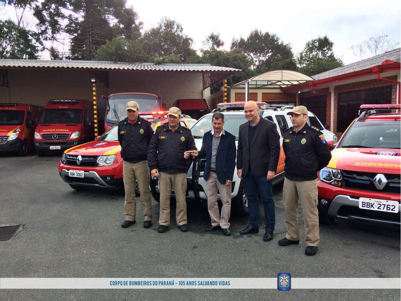 Na manhã do dia 20 de julho, estiveram presentes no Quartel do Comando do 6º Grupamento de Bombeiros, na cidade de São José dos Pinhais, o Exmo. Senhor Prefeito de São José dos Pinhais Toninho Fenelon, o Senhor Vice Prefeito e Secretário de Obras Thiago Buhrer, o Senhor Secretário de Comunicação Social Claudio Alves e vereadores da cidade, juntamente o Comandante do 6 º GB Senhor Major QOBM Edson Manassés e outros oficiais e praças do Grupamento para participar da solenidade de entrega de três novas viaturas, sendo duas ABS Duster, e uma ABS Frontier.