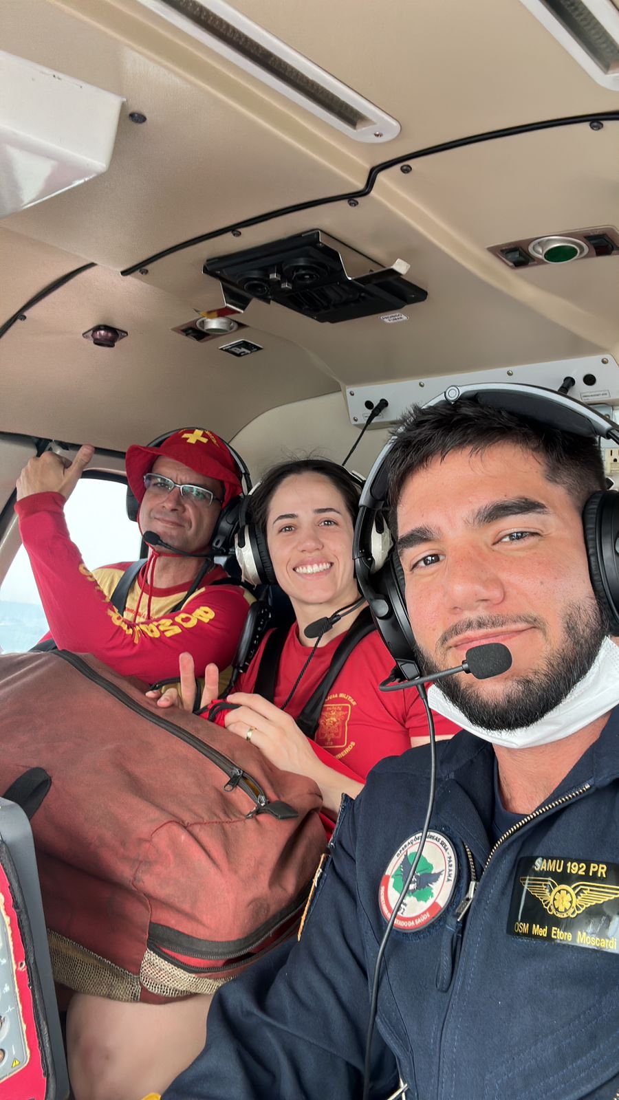 Da esquerda para direita na foto: 1º Sargento Alysson, Cabo Tainara e Médico Dr. Etore em deslocamento para ocorrência na aeronave Saúde 10.