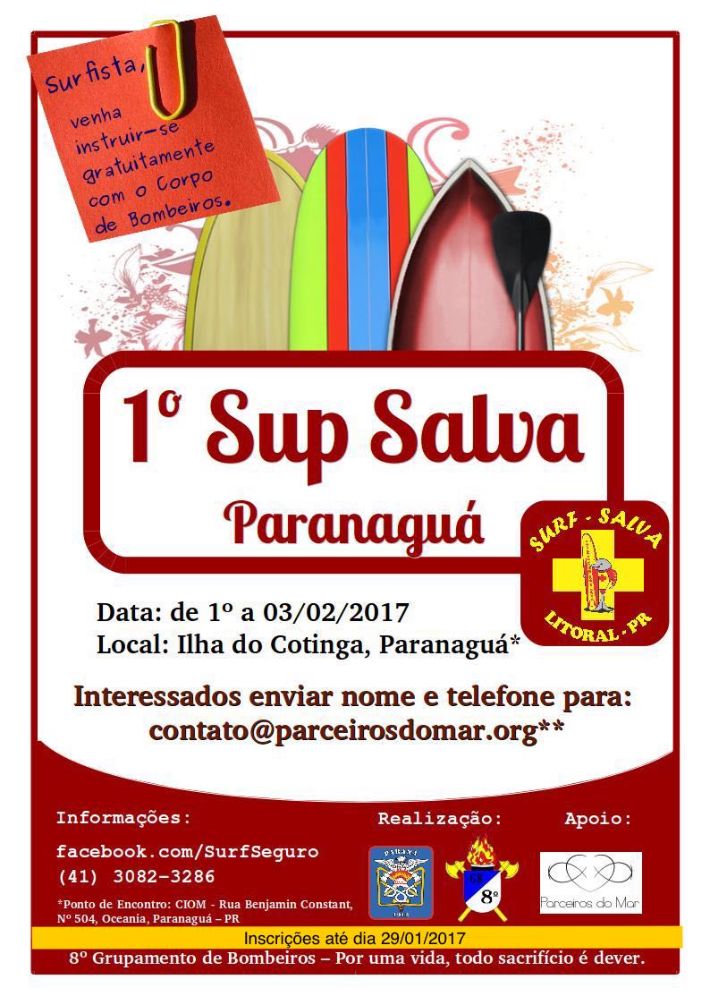 Durante os dias 1º, 2 e 3 de fevereiro, o Corpo de Bombeiros, através de sua unidade no litoral do estado, o 8º Grupamento de Bombeiros (8º GB), realizará curso de capacitação do projeto “SUP Salva”. Tradicionalmente a corporação aproveita a temporada de verão para desenvolver nos surfistas locais conscientização dos riscos de afogamento, possibilitando que eles ajam em prol da segurança dos banhistas. Para esta temporada, a novidade é a edição do primeiro “SUP Salva”, que tem por base as mesmas doutrinas do “Surf Salva”, com especialidade aos praticantes do SUP – sigla para Stand Up Padle, modalidade variante do surf, que vem crescendo em popularidade, na qual o praticante em pé, numa prancha, usa um remo para se mover através da água.