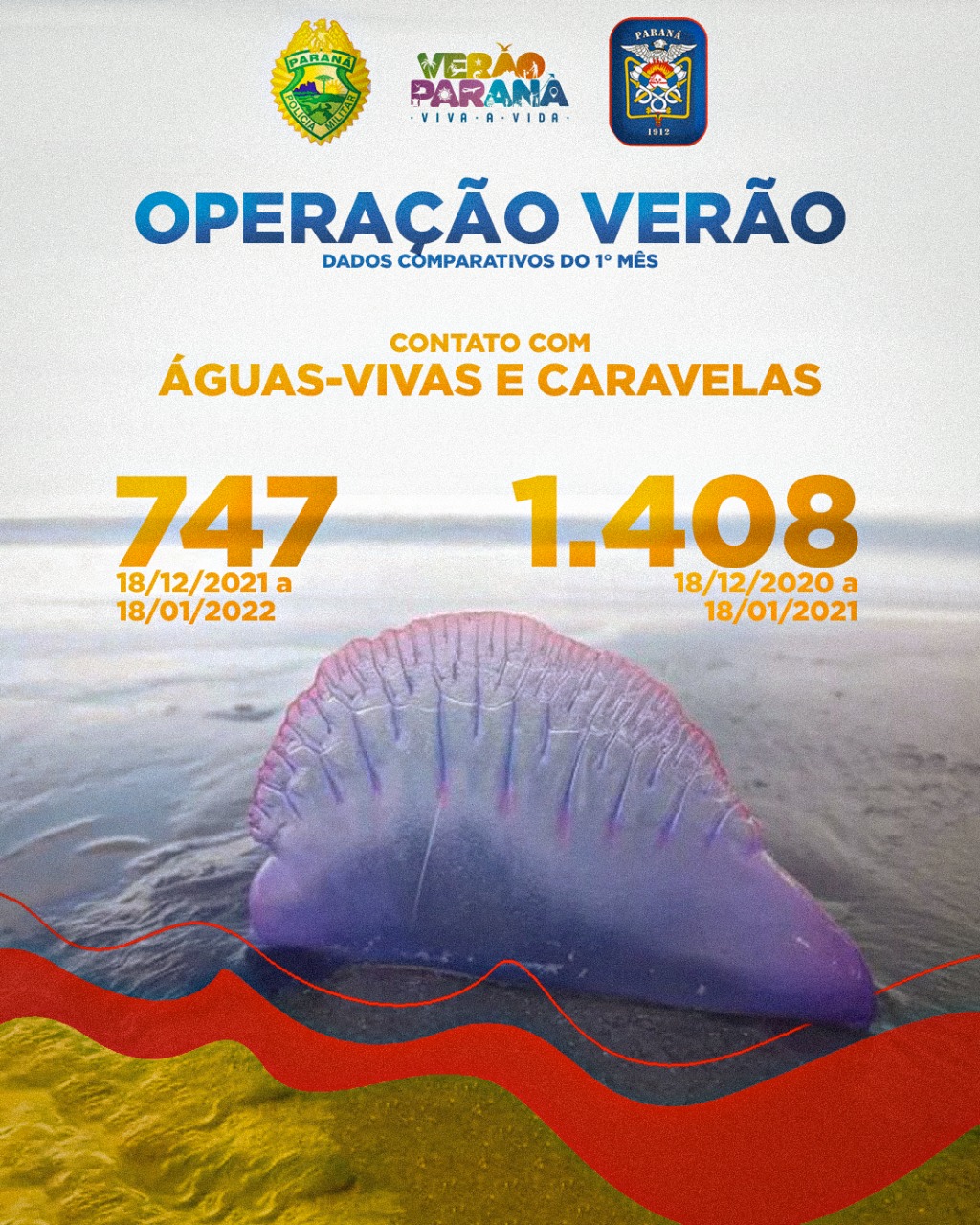 Houve uma queda de 47% no número de pessoas que tiveram contato com águas-vivas ou caravelas em nosso litoral, reduzindo de 1.408 para 747.
