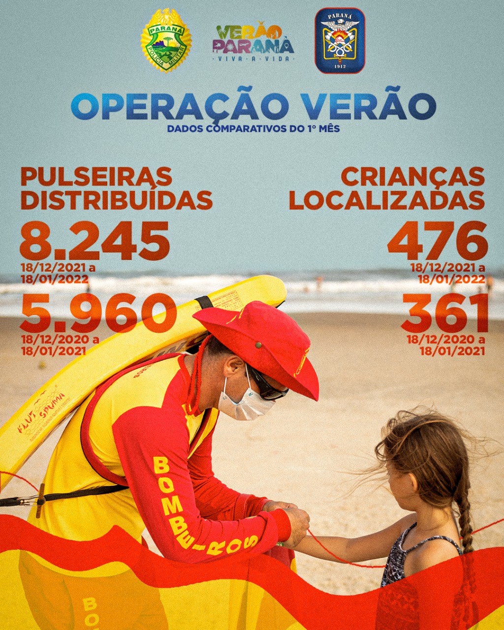 Foi registrado um aumento de 38% na distribuição de pulseirinhas, de 5.960 para 8.245. Mesmo assim, o número de crianças que se perderam de seus pais ou responsáveis e precisaram do apoio dos guarda-vidas para o reencontro também aumentou, de 361 para 476. Importante ressaltar que todas foram localizadas após a intervenção do Corpo de Bombeiros e quase a totalidade dessas crianças não utilizava a pulseirinha disponibilizada pela Corporação.