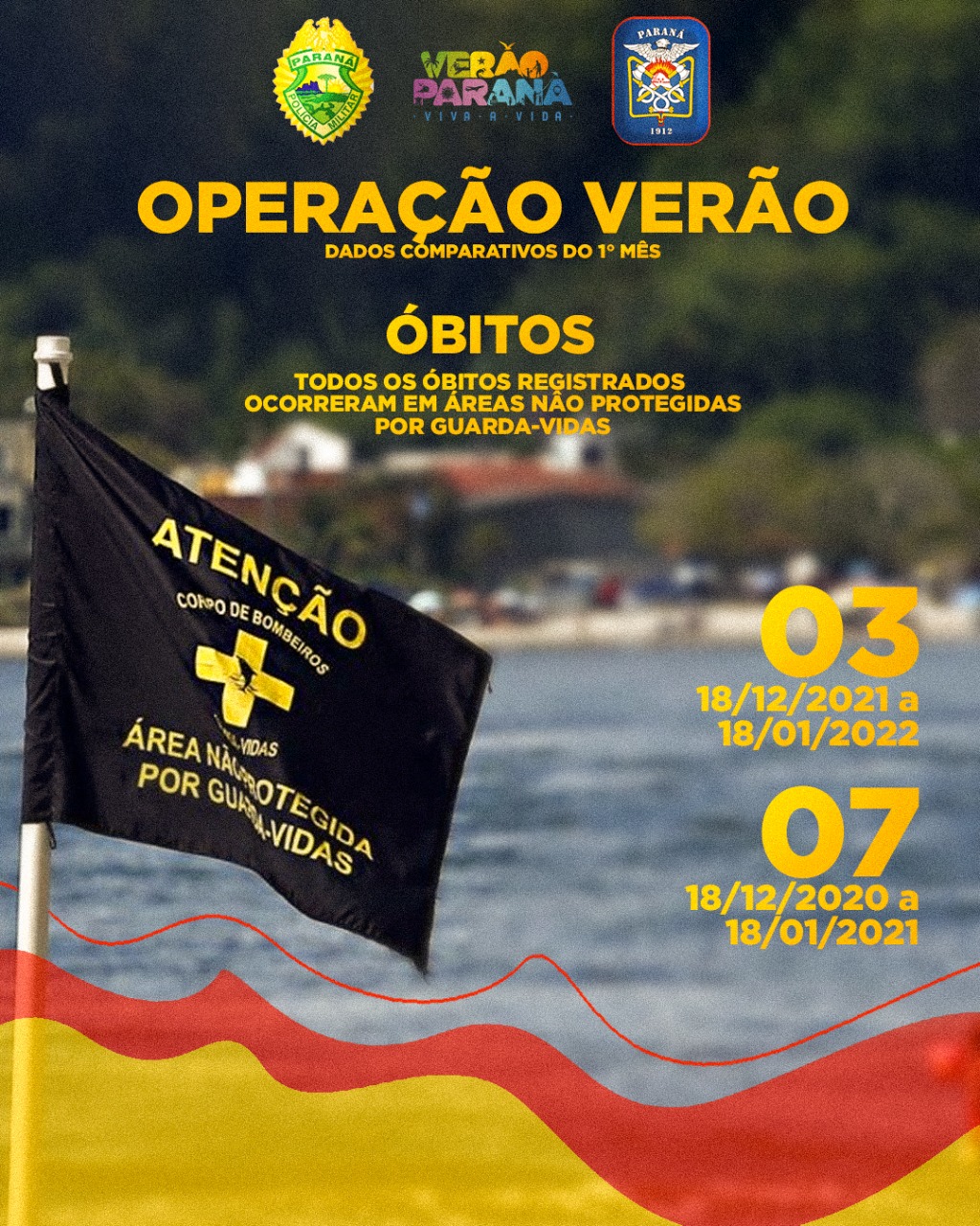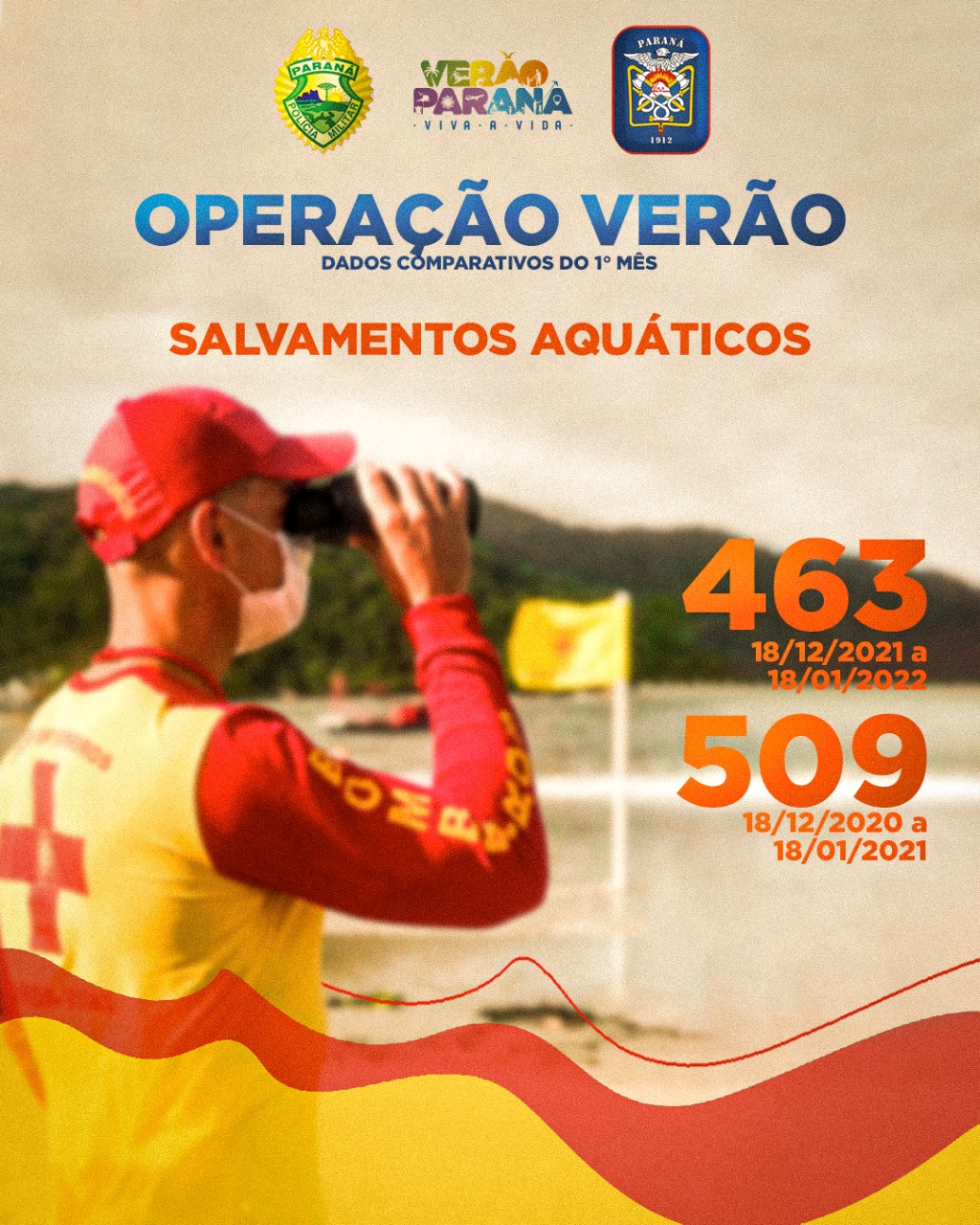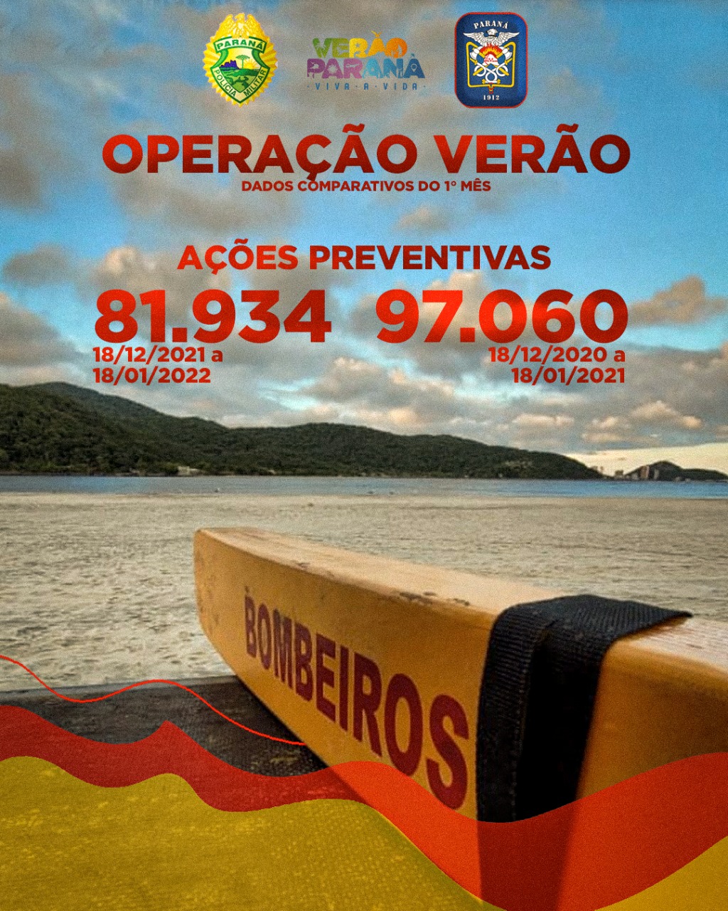Nesta temporada em nosso litoral, os trabalhos de prevenção e salvamento aquáticos realizados pelo Corpo de Bombeiros iniciaram-se oficialmente em 18 de dezembro de 2021. A estatística apresentada a seguir é comparativa deste primeiro mês com relação ao mesmo período da temporada passada, com dados até 18 de janeiro de 2022.