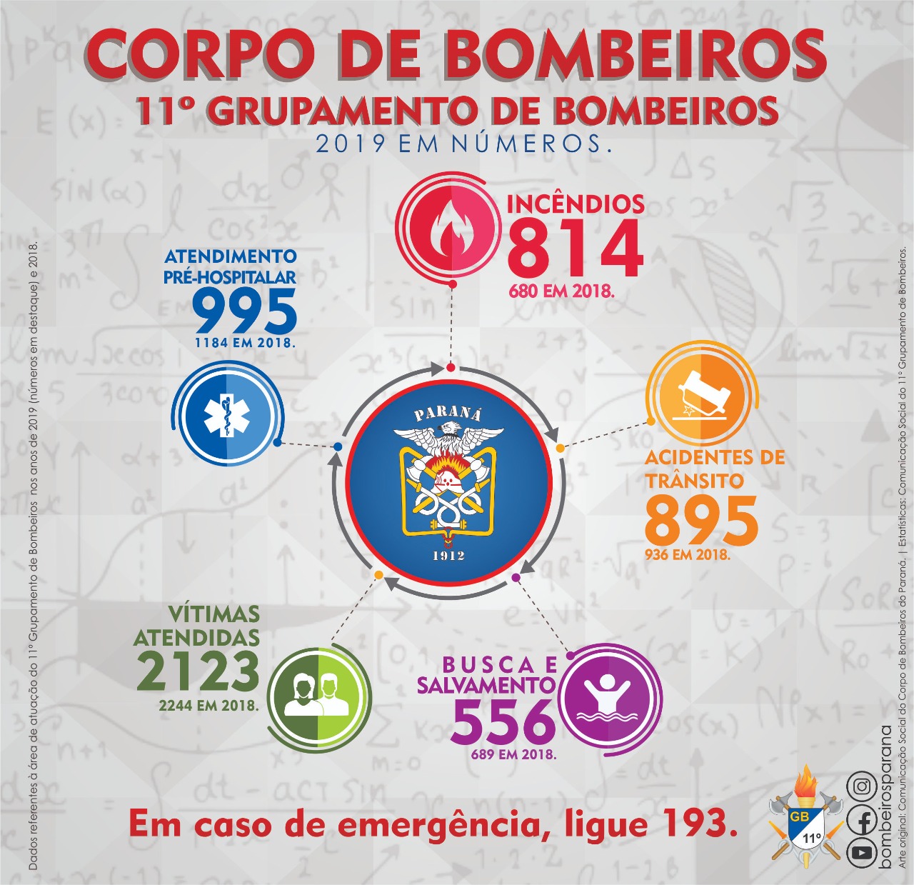 O 11º Grupamento de Bombeiros, que tem sede em Apucarana e atua em 22 municípios da região, apresenta os dados referentes à nossa Unidade. Realçados estão os números de 2019 e, logo abaixo, o quantitativo de 2018.