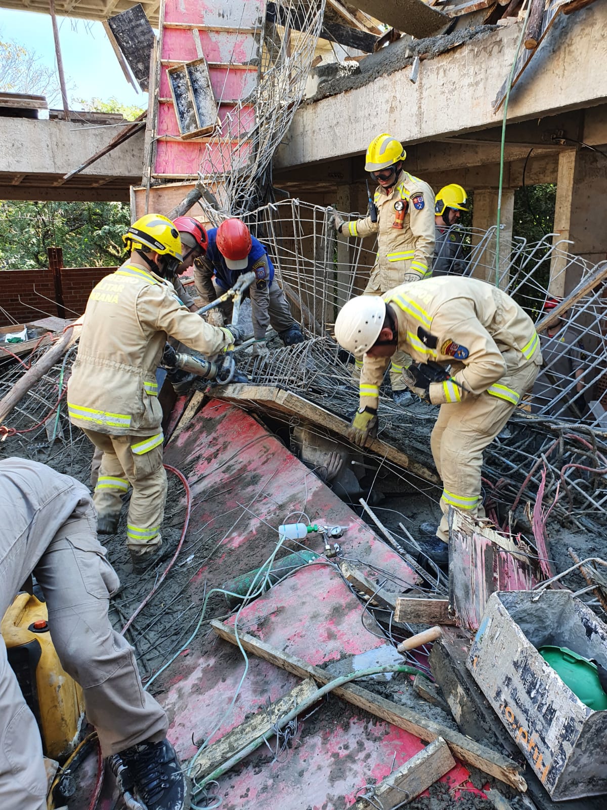 As duas vítimas que ficaram sob a estrutura, estavam muito próximas, o que dificultava a progressão do resgate. Um estava apoiado sobre um compensado que estava próximo à cabeça do segundo, que estava mais em posição mais profunda. Foram cortados muitos vergalhões de ferro com desencarceradores veiculares, removidas grandes quantidades de madeira e concreto fresco, para assim conseguir acesso aos dois homens. Ao mesmo tempo, a equipe médica do Samu realizou, tão logo o espaço permitiu, ações de suporte avançado de vida e monitorização da vítima, especialmente pelo risco de lesões inerentes à compressão prolongadas, como a Síndrome de Esmagamento (Crush) e Síndrome Compartimental.