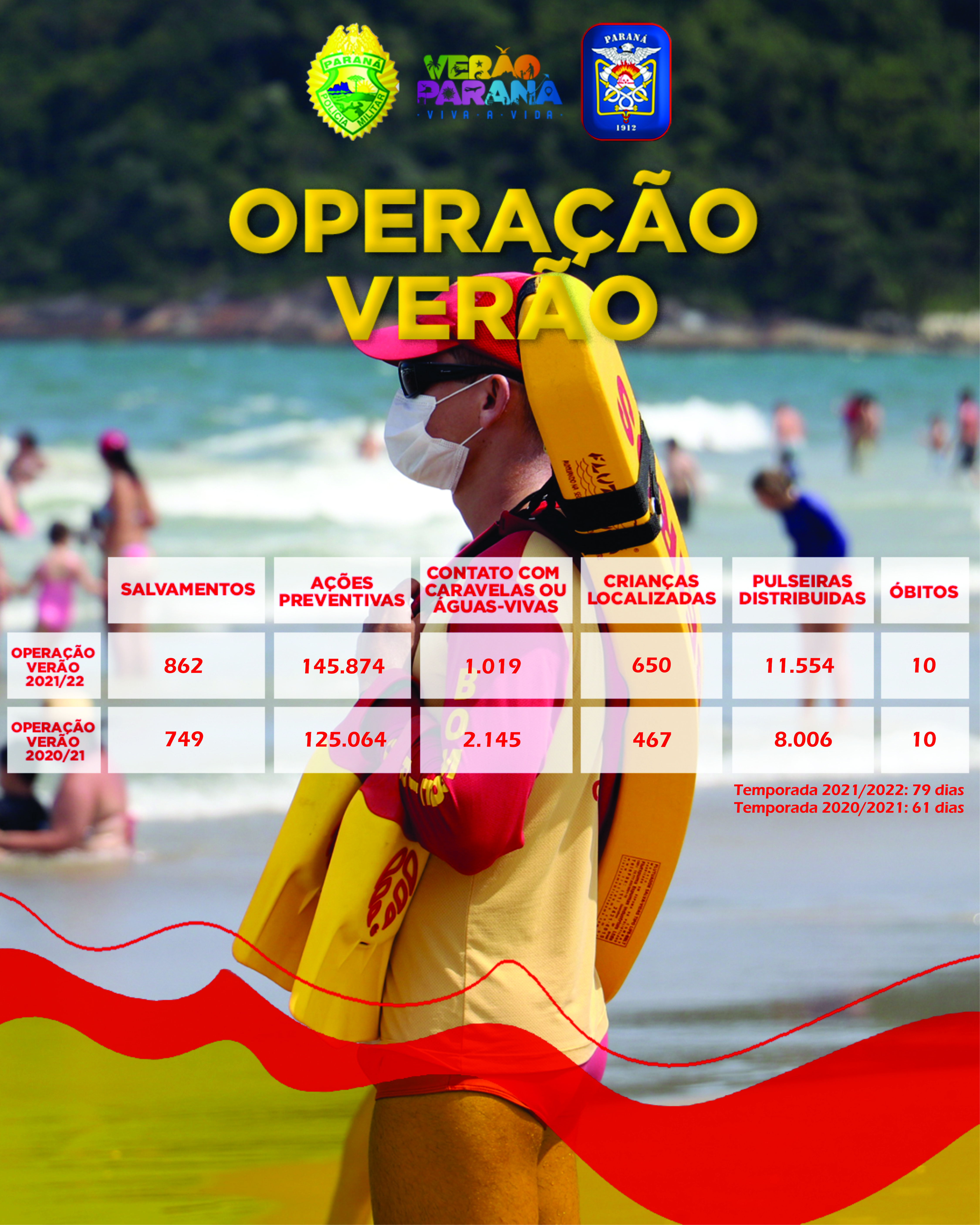 Nestes 79 dias de ininterruptos trabalhos da Operação Verão 2021/2022, de 18 de dezembro de 2021 a 6 de março de 2022, foram disponibilizados 91 postos de Guarda-Vidas distribuídos por Pontal do Paraná, Matinhos, Guaratuba, Morretes e Ilha do Mel, além de um Posto Tático Móvel em Morretes.