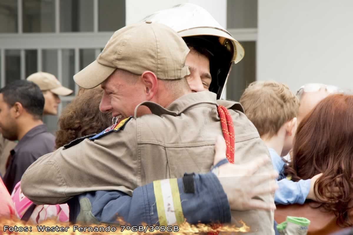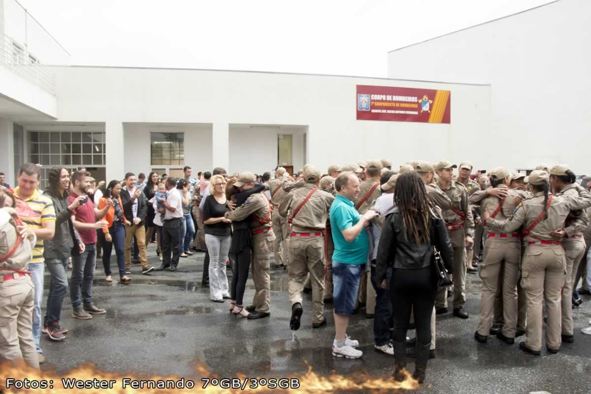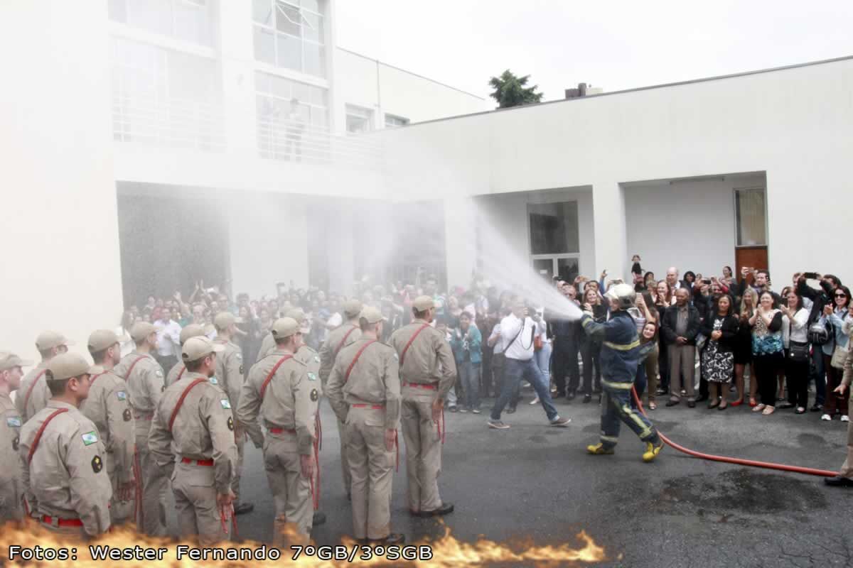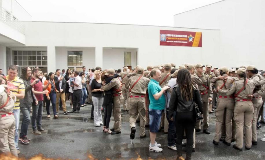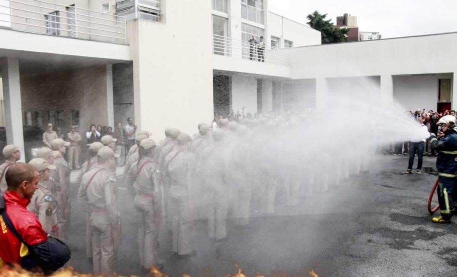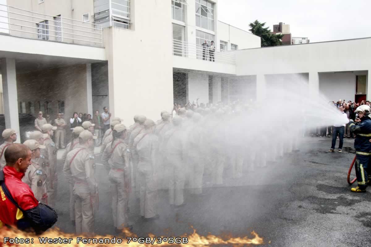 Após a recepção e palavras do Comandante da Unidade, os alunos foram surpreendidos pela presença dos familiares enquanto passavam pelo tradicional banho de mangueira, conhecido no meio militar como “batismo”.