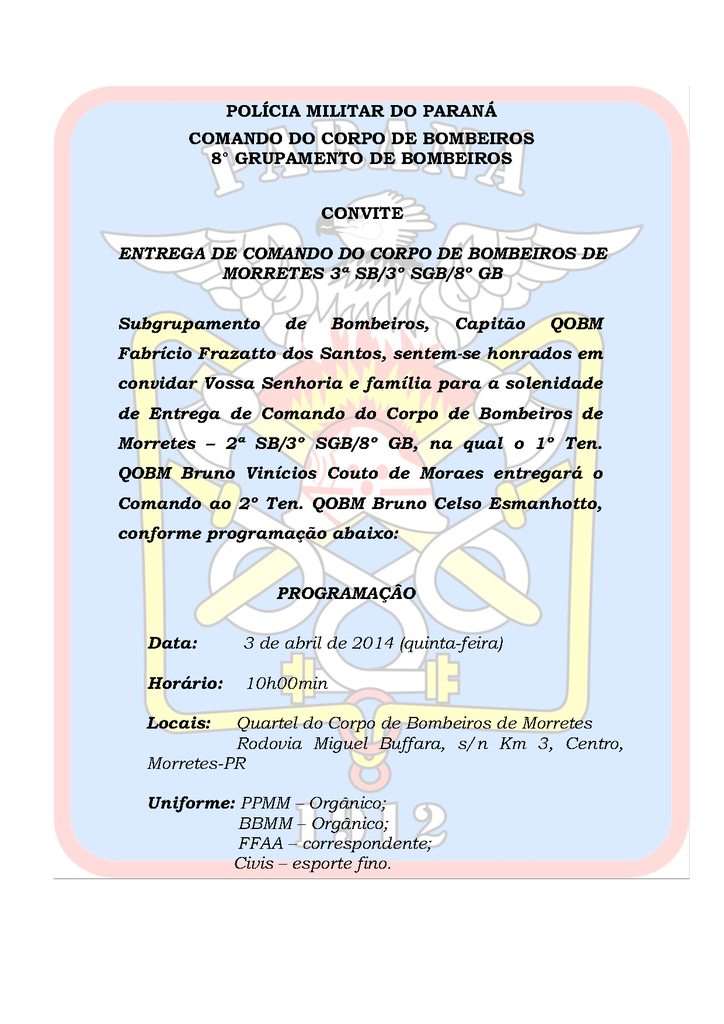 Subgrupamento de Bombeiros, Capitão QOBM Fabrício Frazatto dos Santos, sentem-se honrados em convidar Vossa Senhoria e família para a solenidade de Entrega de Comando do Corpo de Bombeiros de Morretes – 2ª SB/3º SGB/8º GB, na qual o 1º Ten. QOBM Bruno Vinícios Couto de Moraes entregará o Comando ao 2º Ten. QOBM Bruno Celso Esmanhotto, conforme programação abaixo: