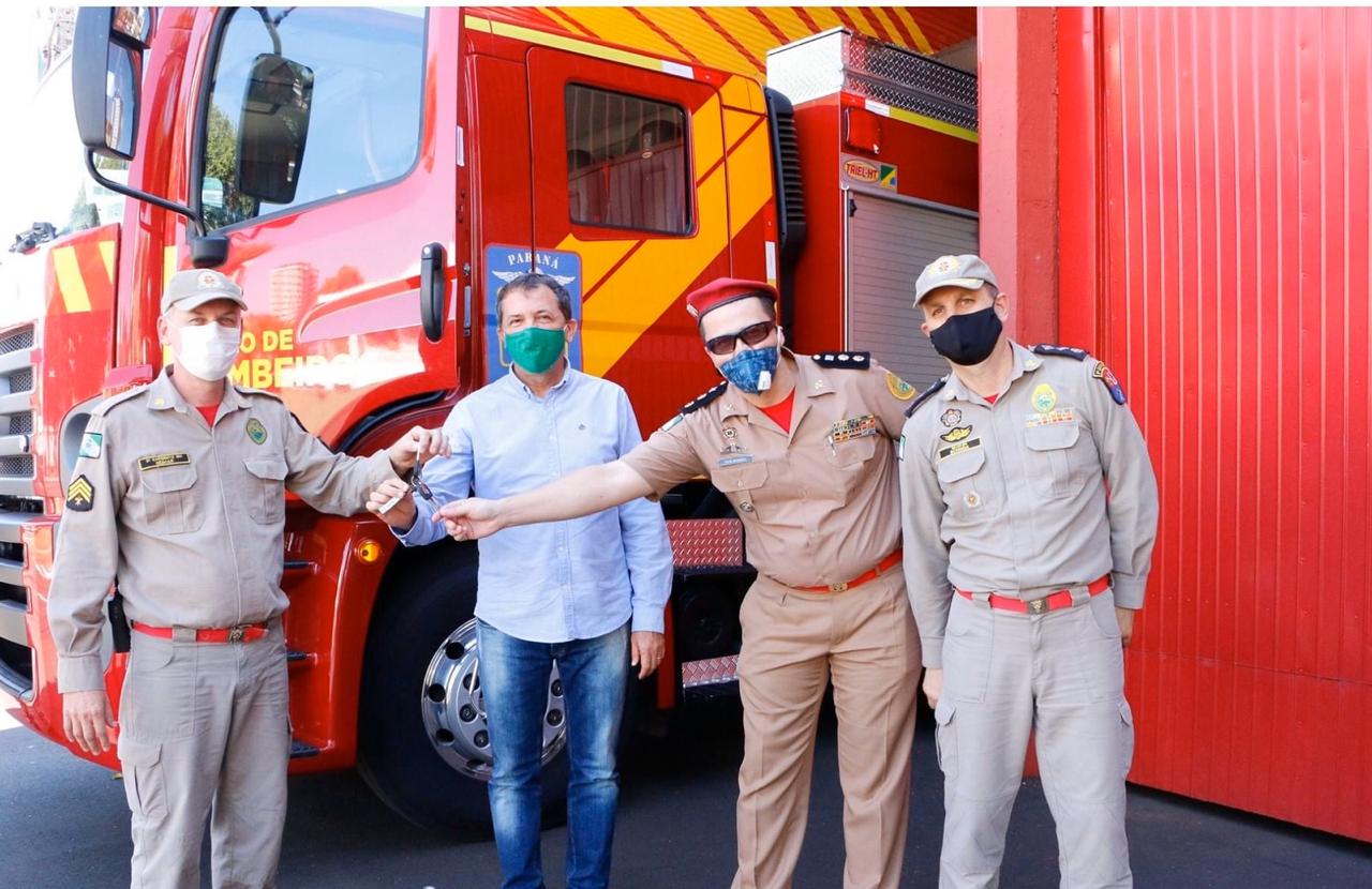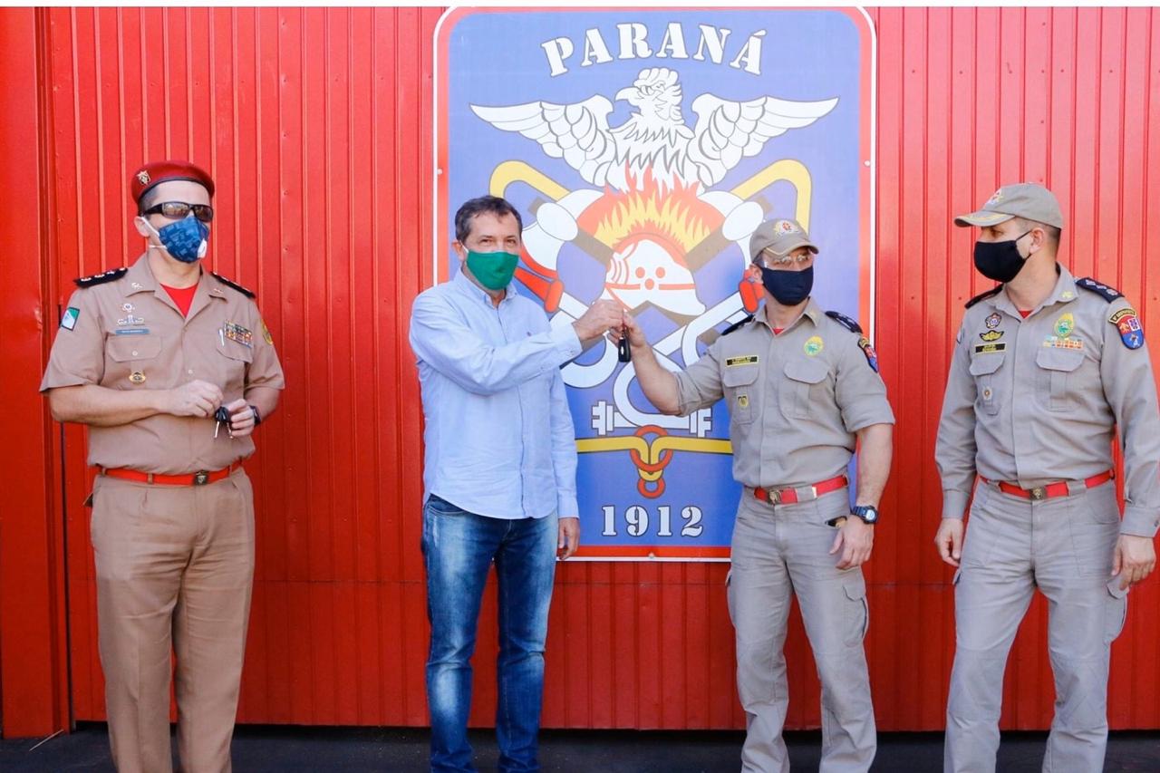 O Sr. Comandante do 3º Comando Regional de Bombeiros, Tenente - Coronel Gelson Marcelo Jahnke, representando o Sr. Comandante do Corpo de Bombeiros, Coronel Samuel Prestes, fez a entrega das chaves ao Sr. Francisco Larcerda Brasileiro (Chico Brasileiro) - Prefeito de Foz do Iguaçu que na sequência passou as chaves do ABTR ao 3º Sgt. Neimar Luiz da Silva e do veículo Cruze ao Cabo Paulo Andrieli Nunes Saueressig.